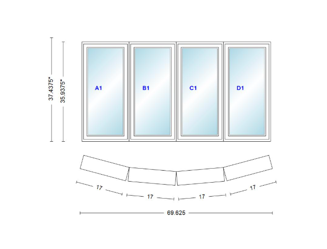 Andersen 400 series 4 wide casement bow window 69 5/8" wide casements with fixed casement flankers 10 degree angle of deflection vinyl exterior wood interior low-e4 dual pane argon gas