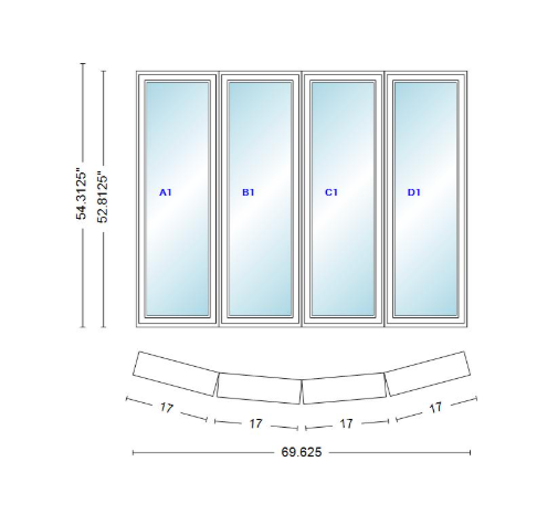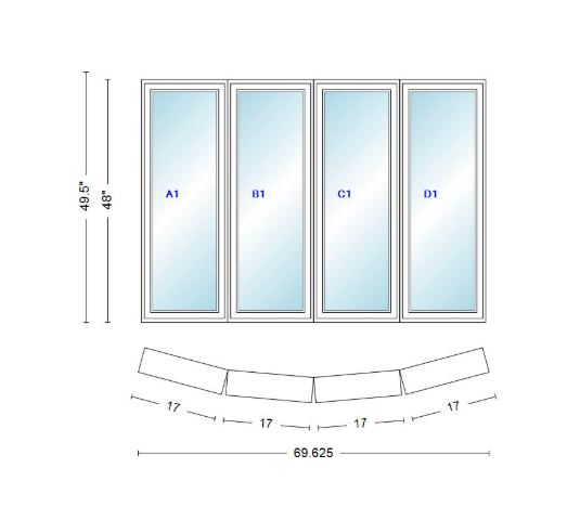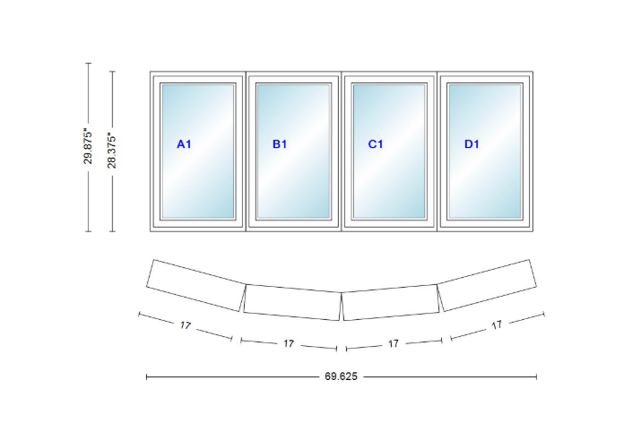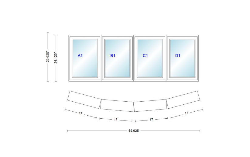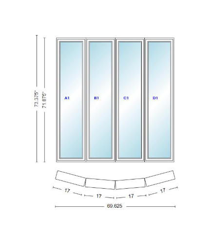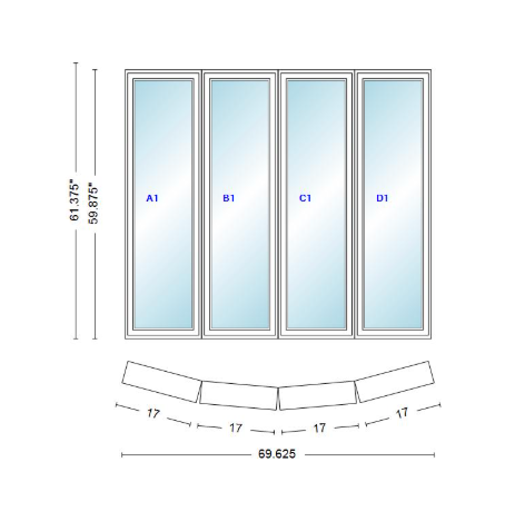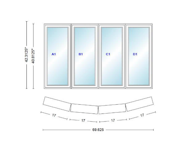 Andersen 400 series 4 wide casement bow window 69 5/8" wide casements with fixed casement flankers 10 degree angle of deflection vinyl exterior wood interior low-e4 dual pane argon gas