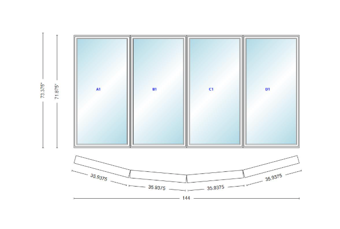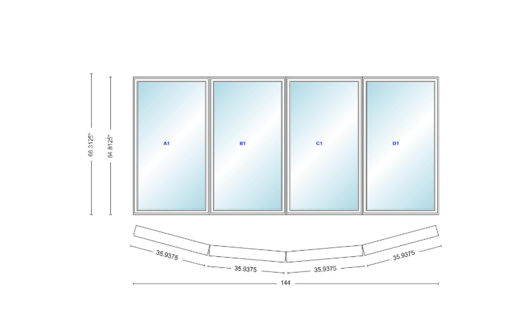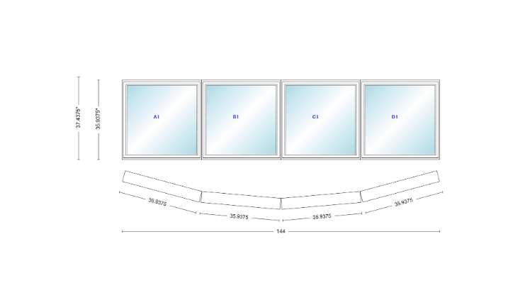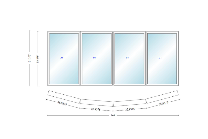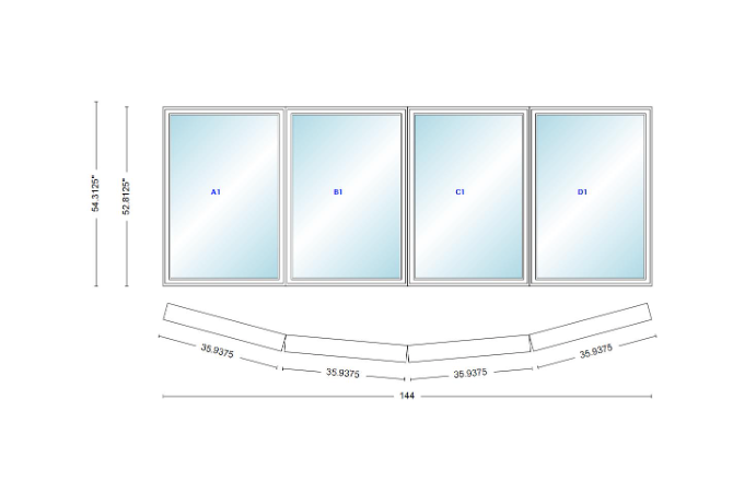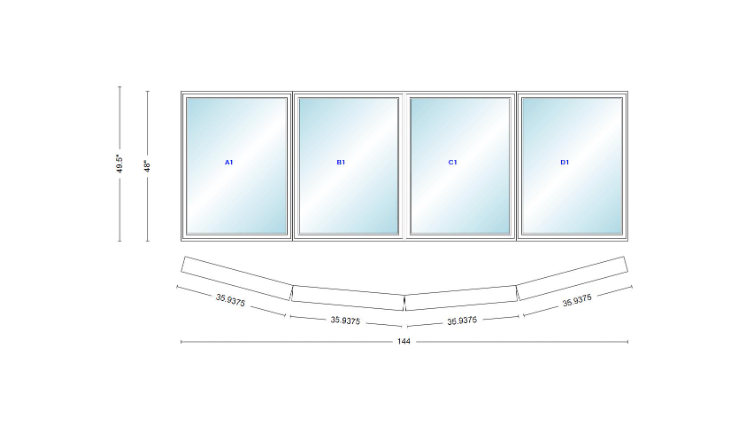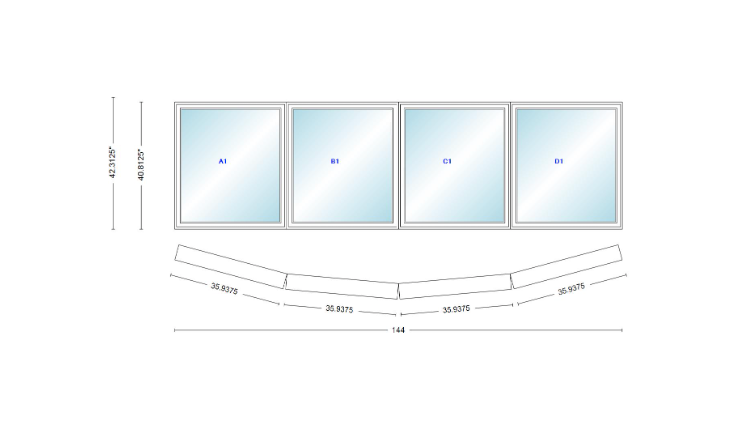 Andersen 400 series 4 wide casement bow window 144" wide casements with fixed casement flankers 10 degree angle of deflection vinyl exterior wood interior low-e4 dual pane argon gas
