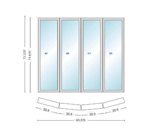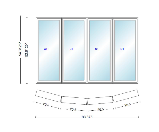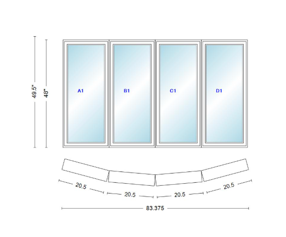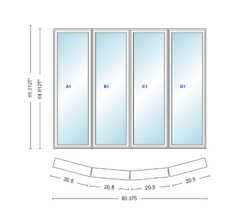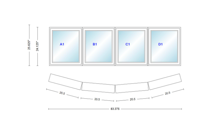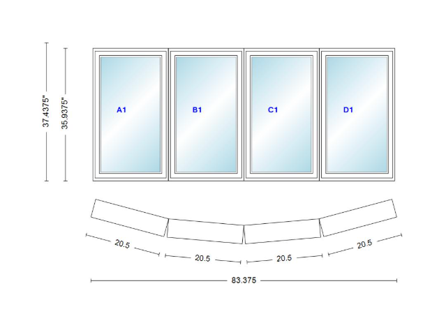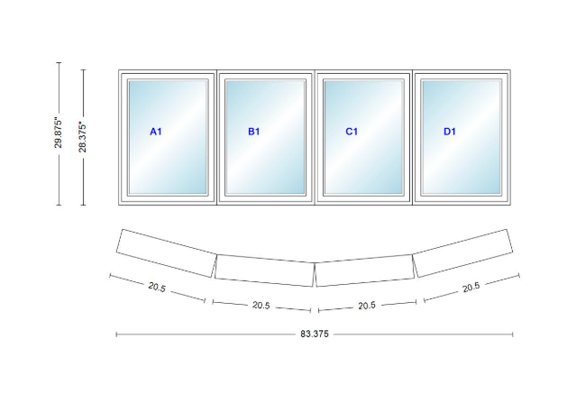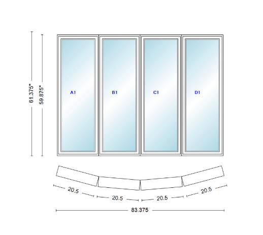 Andersen 400 series 4 wide casement bow window 83 3/8" wide casements with fixed casement flankers 10 degree angle of deflection vinyl exterior wood interior low-e4 dual pane argon gas