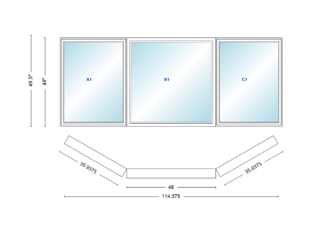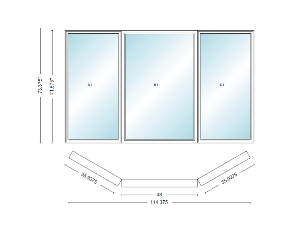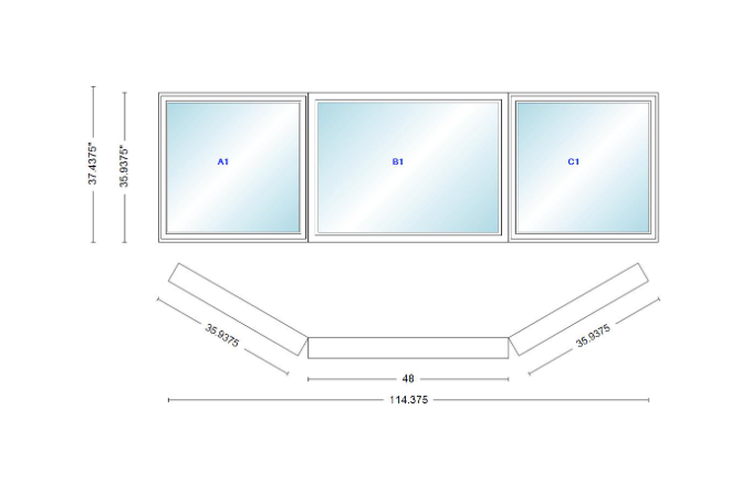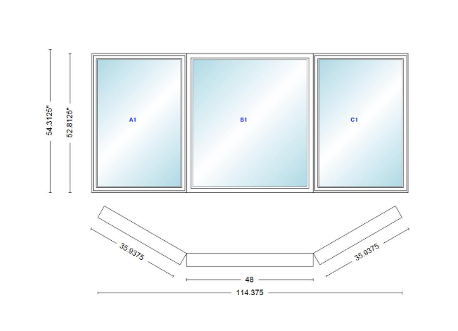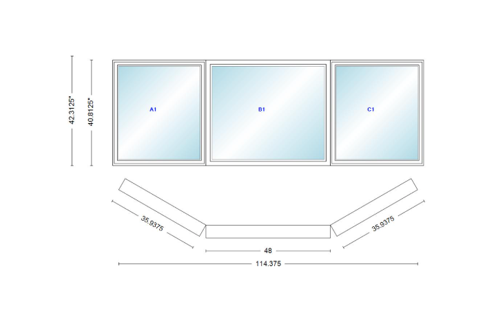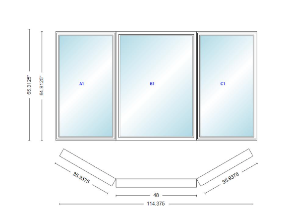 Andersen 400 series casement bay window left-stationary-right 114 3/8" wide picture with casement flankers 30 degree angle of deflection vinyl exterior wood interior low-e4 dual pane argon gas