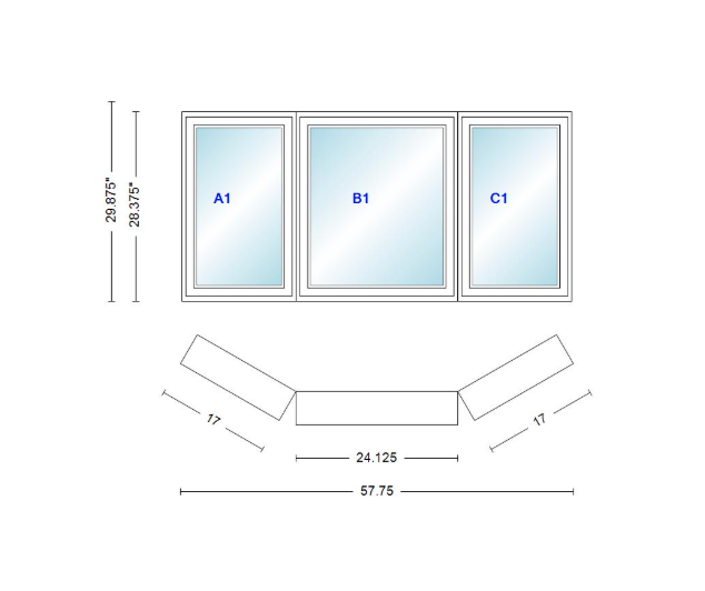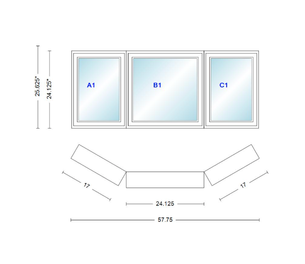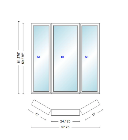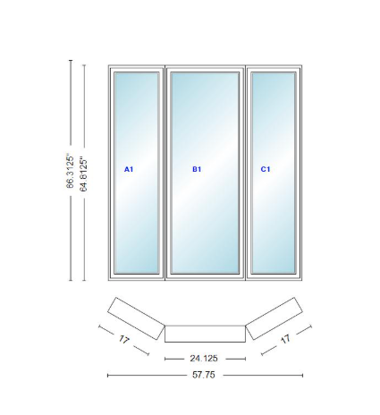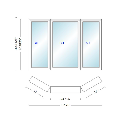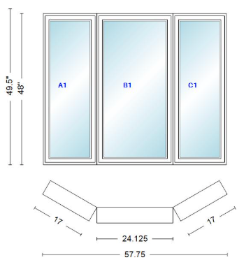 Andersen 400 series casement bay window left-stationary-right 57 3/4" wide casement with casement flankers 30 degree angle of deflection vinyl exterior wood interior low-e4 dual pane argon gas