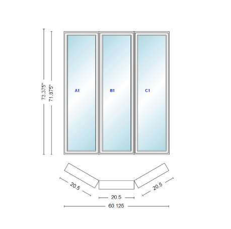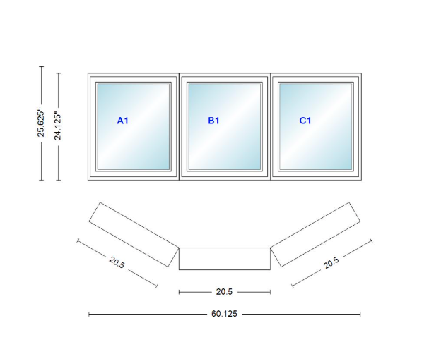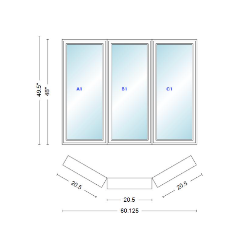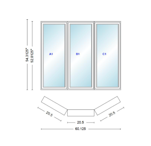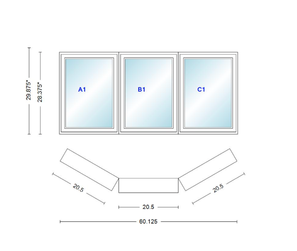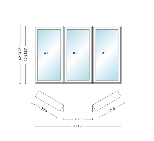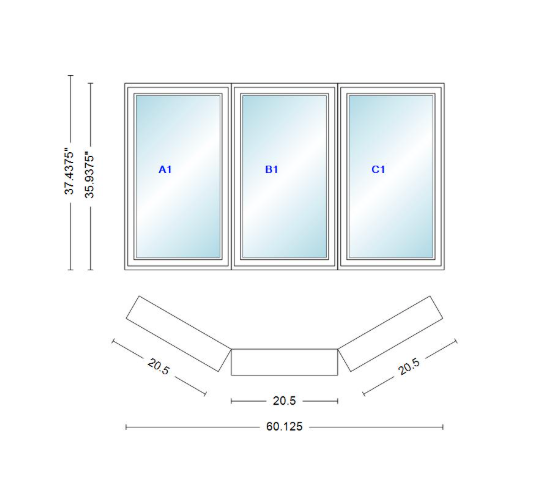 Andersen 400 series casement bay window left-stationary-right 60 1/8" wide casement with casement flankers 30 degree angle of deflection vinyl exterior wood interior low-e4 dual pane argon gas