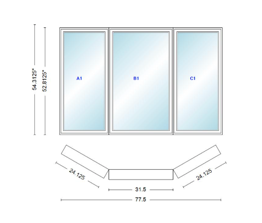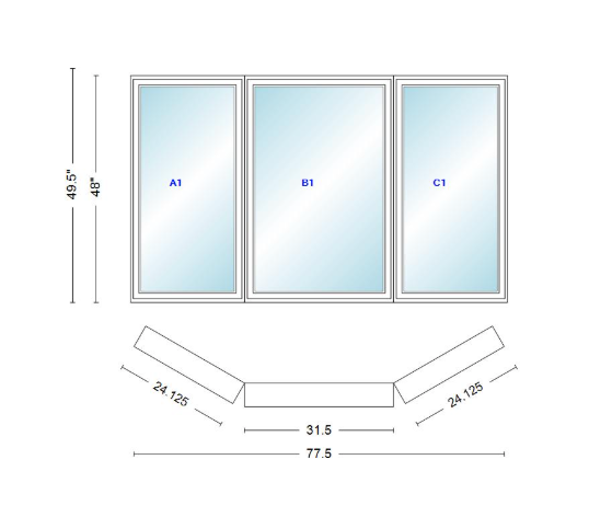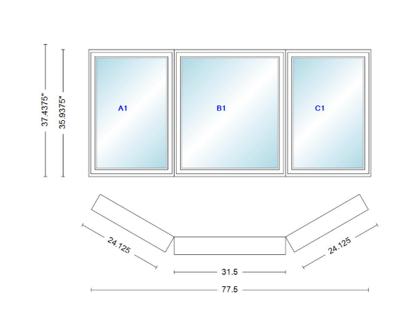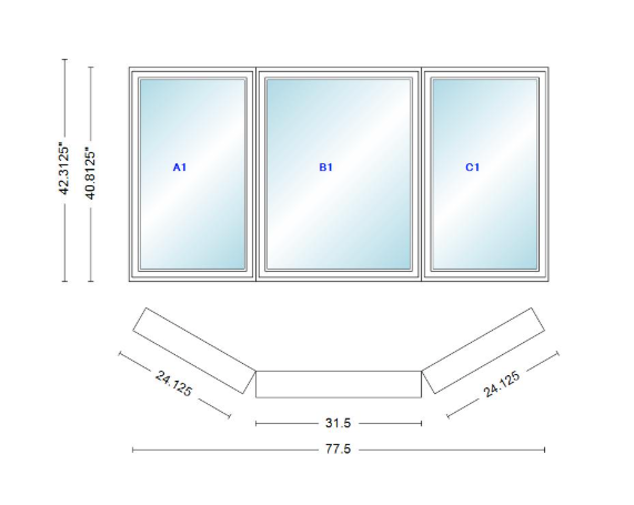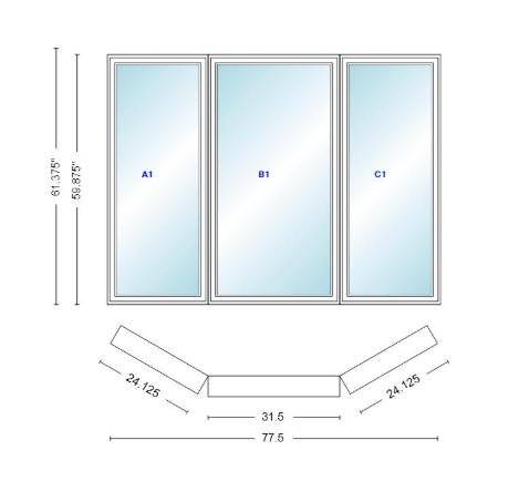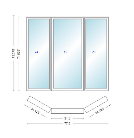 Andersen 400 series casement bay window left-stationary-right 77 1/2" wide casement with casement flankers 30 degree angle of deflection vinyl exterior wood interior low-e4 dual pane argon gas