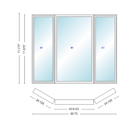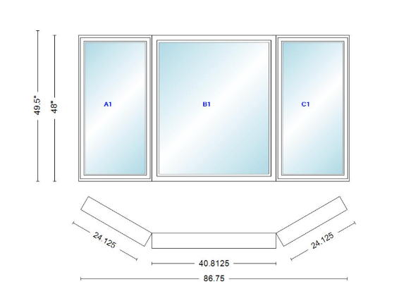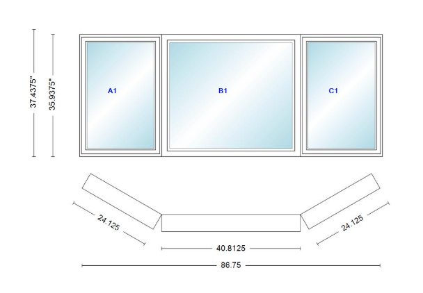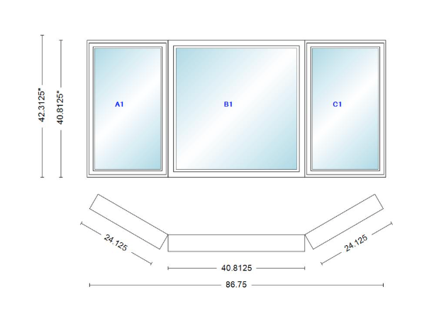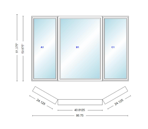 Andersen 400 series casement bay window left-stationary-right 86 3/4" wide picture with casement flankers 30 degree angle of deflection vinyl exterior wood interior low-e4 dual pane argon gas