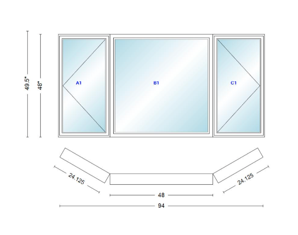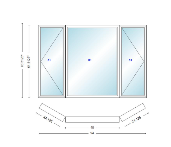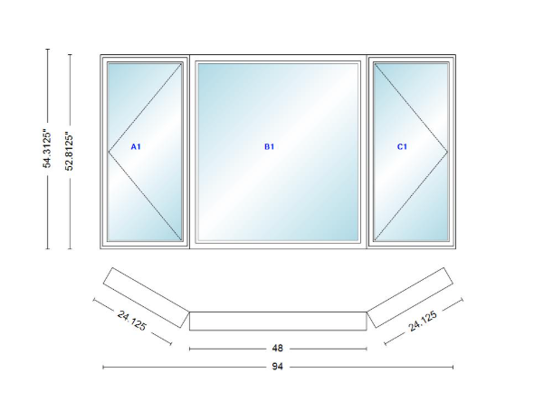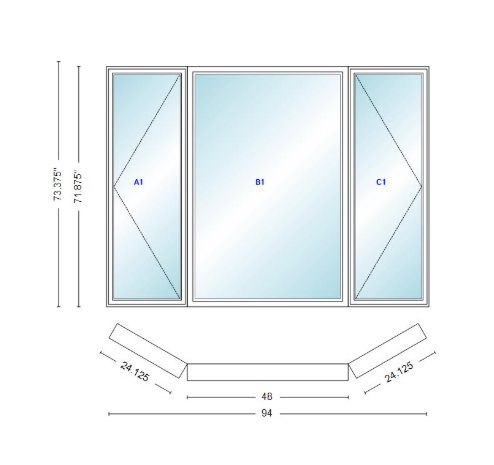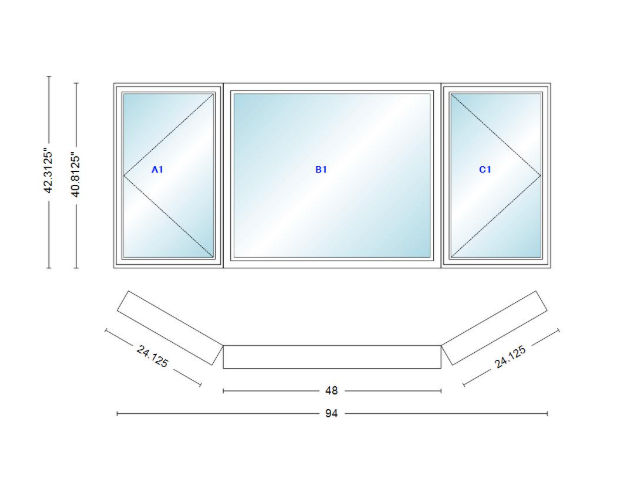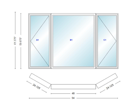 Andersen 400 series casement bay window left-stationary-right 94" wide picture with casement flankers 30 degree angle of deflection vinyl exterior wood interior low-e4 dual pane argon gas
