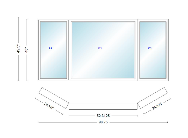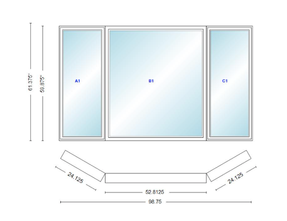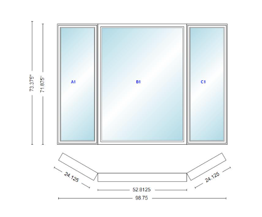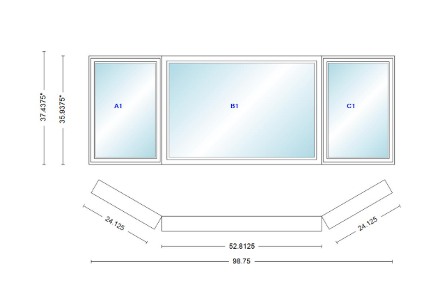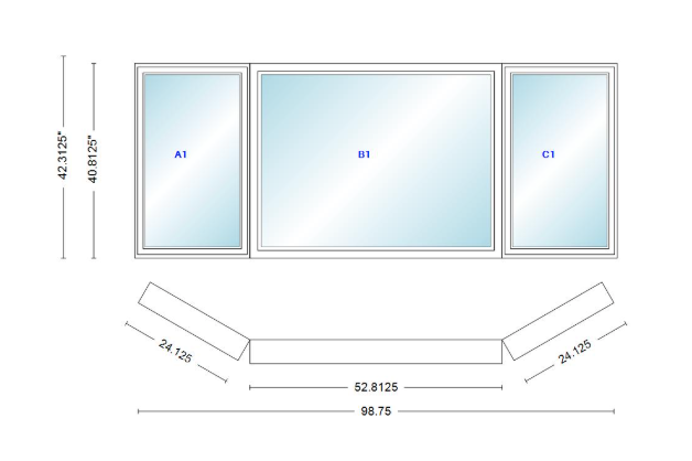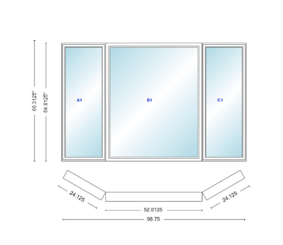 Andersen 400 series casement bay window left-stationary-right 98 3/4" wide picture with casement flankers 30 degree angle of deflection vinyl exterior wood interior low-e4 dual pane argon gas