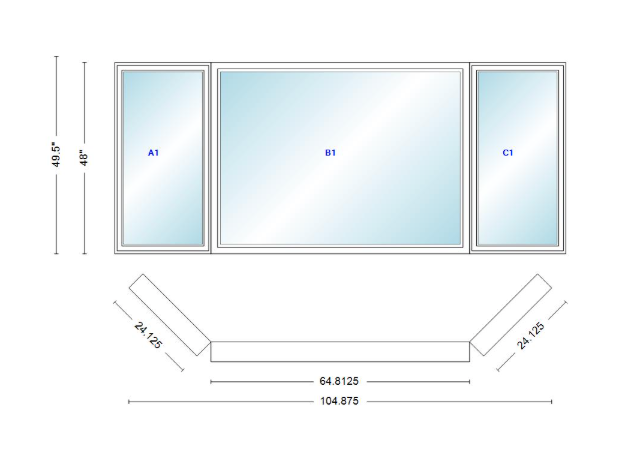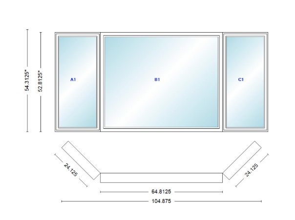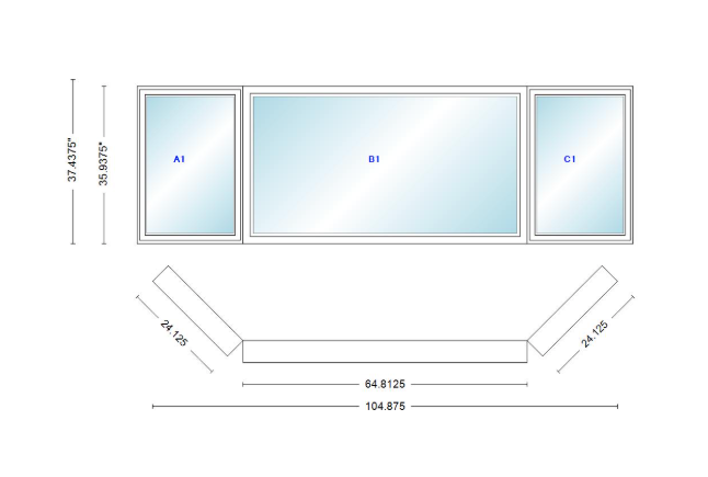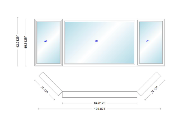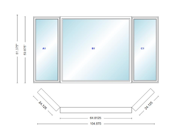 Andersen 400 series casement bay window left-stationary-right 104 7/8" wide picture with casement flankers 45 degree angle of deflection vinyl exterior wood interior low-e4 dual pane argon gas