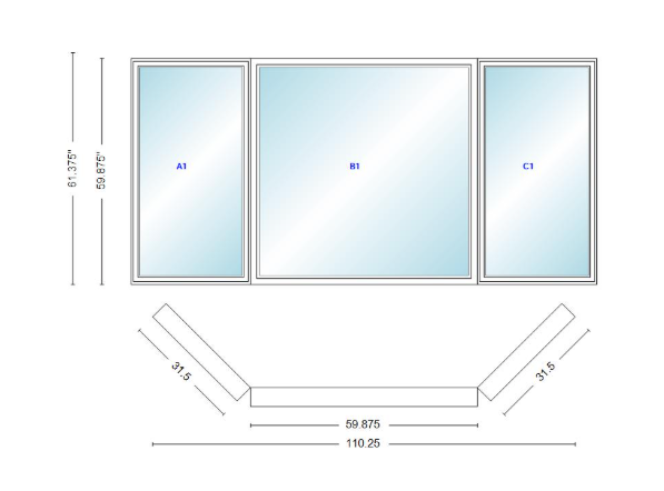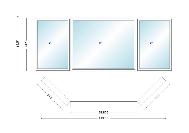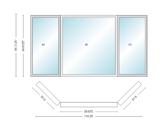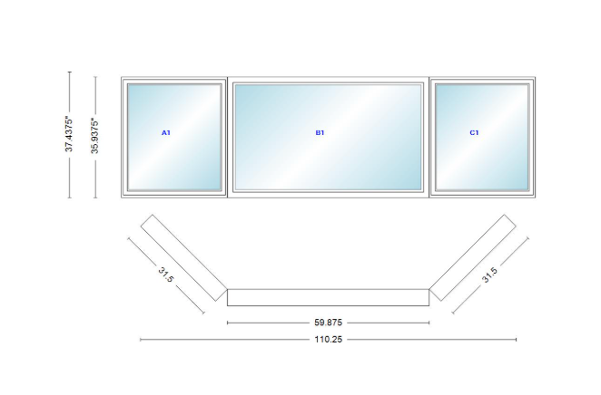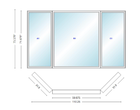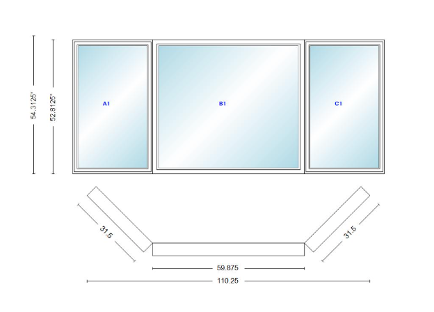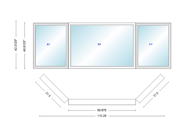 Andersen 400 series casement bay window left-stationary-right 110 1/4" wide picture with casement flankers 45 degree angle of deflection vinyl exterior wood interior low-e4 dual pane argon gas