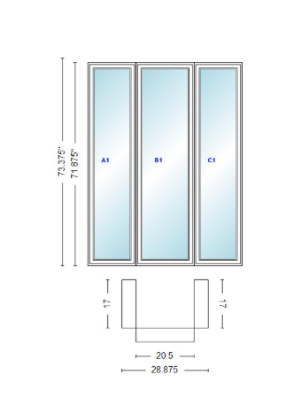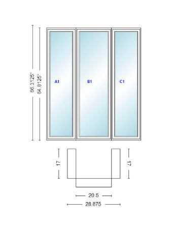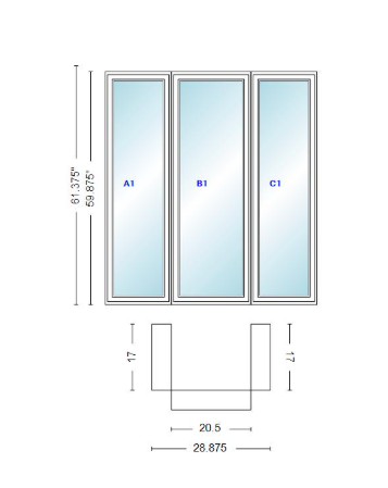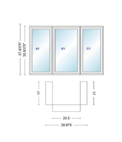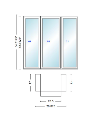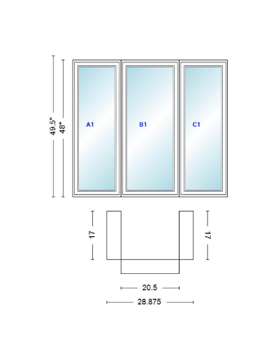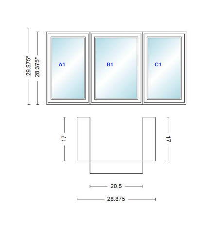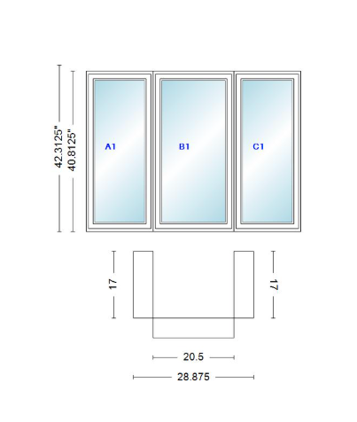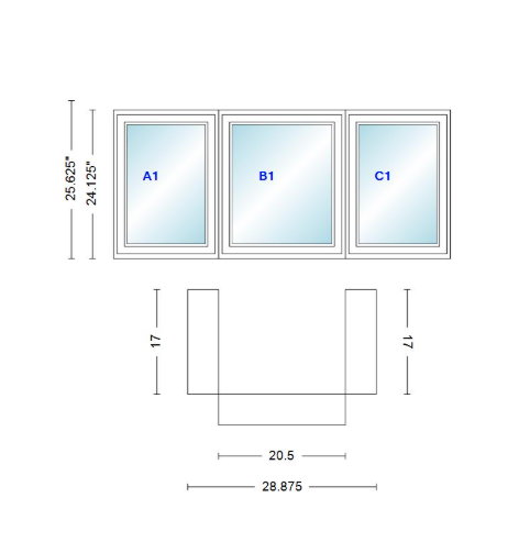 Andersen 400 series casement bay window left-stationary-right 28 7/8" wide casement with casement flankers 90 degree angle of deflection vinyl exterior wood interior low-e4 dual pane argon gas