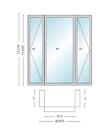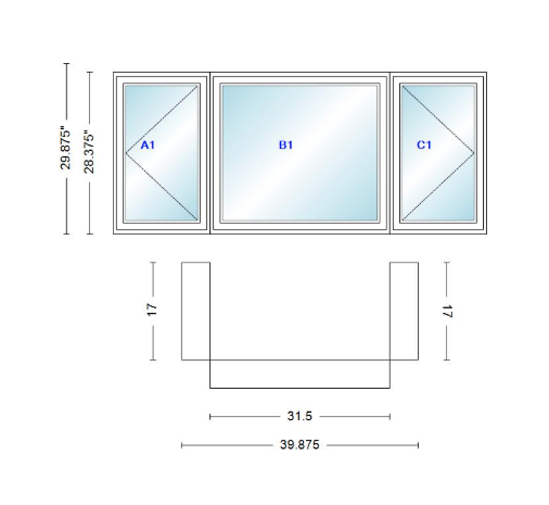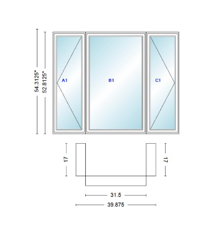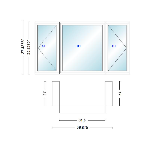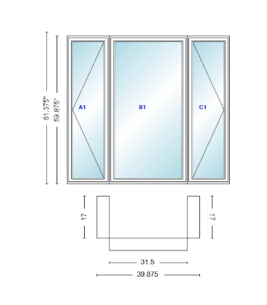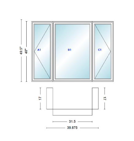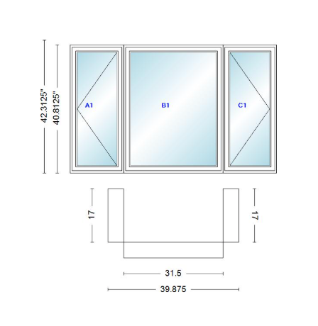 Andersen 400 series casement bay window left-stationary-right 39 7/8" wide casement with casement flankers 90 degree angle of deflection vinyl exterior wood interior low-e4 dual pane argon gas