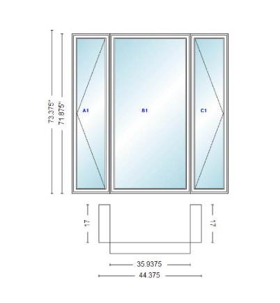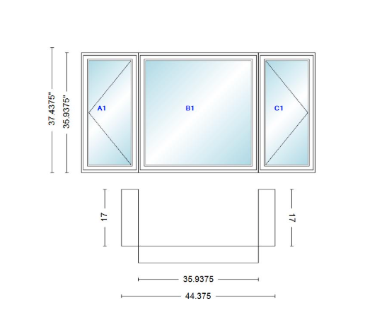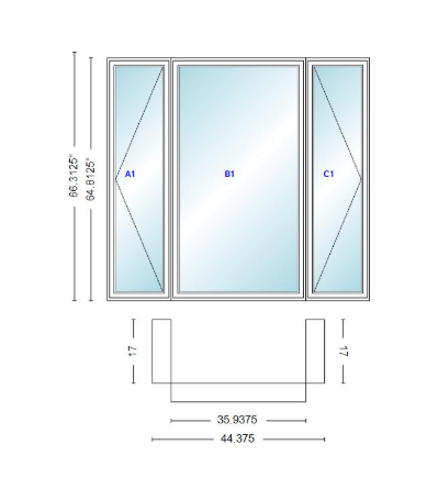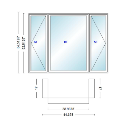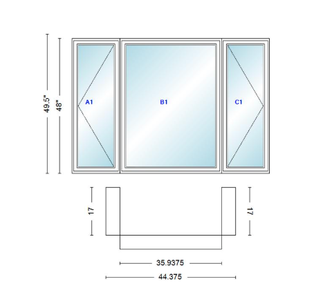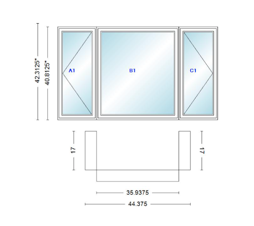 Andersen 400 series casement bay window left-stationary-right 44 3/8" wide casement with casement flankers 90 degree angle of deflection vinyl exterior wood interior low-e4 dual pane argon gas