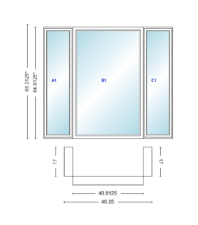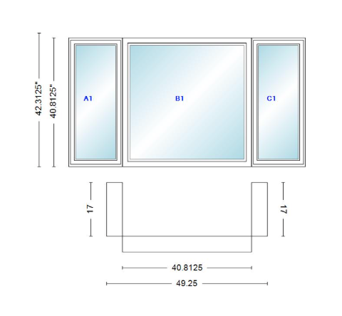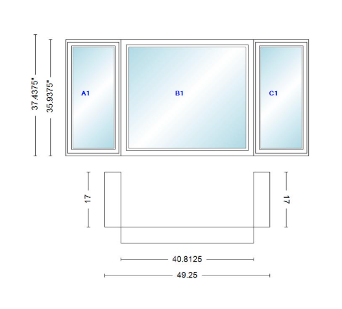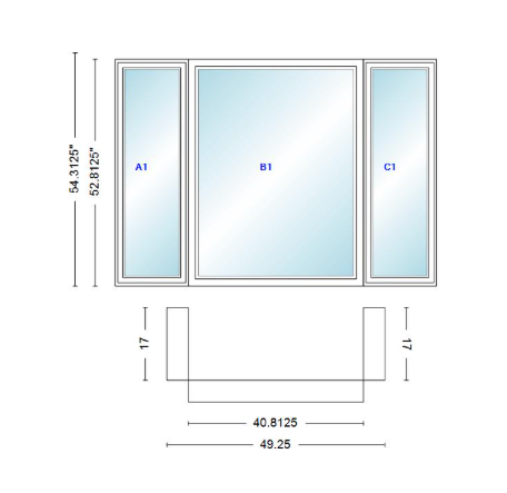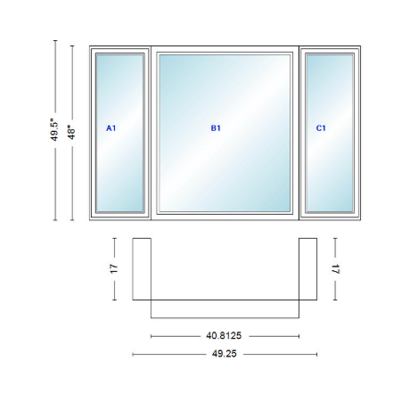 Andersen 400 series casement bay window left-stationary-right 49 1/4" wide picture with casement flankers 90 degree angle of deflection vinyl exterior wood interior low-e4 dual pane argon gas