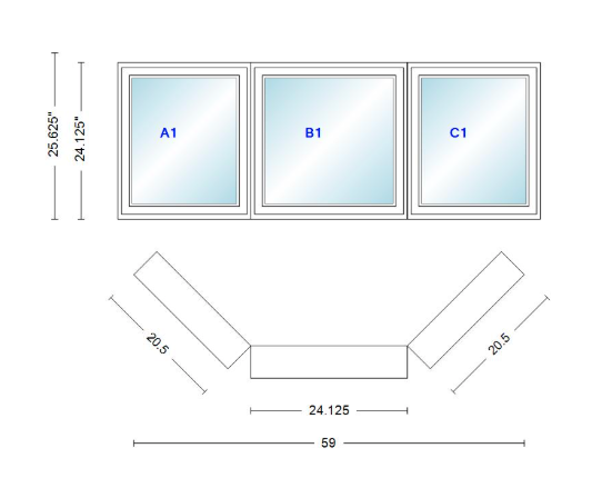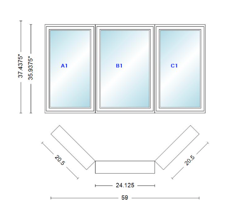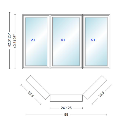 Andersen 400 series casement bay window left-stationary-right 59" wide casement with casement flankers 45 degree angle of deflection vinyl exterior wood interior low-e4 dual pane argon gas