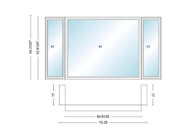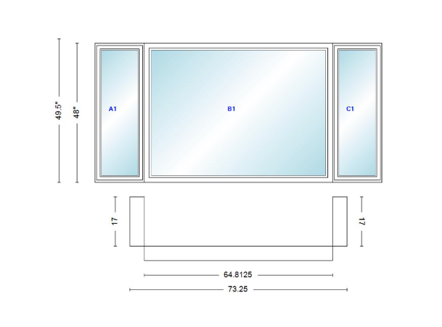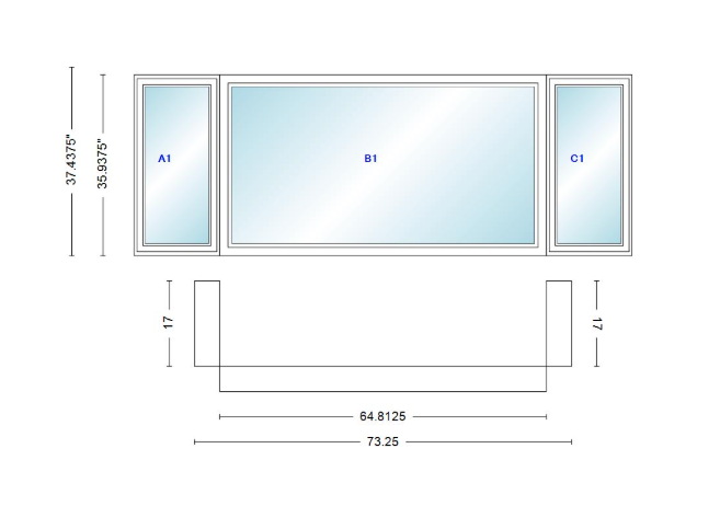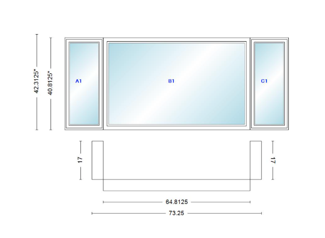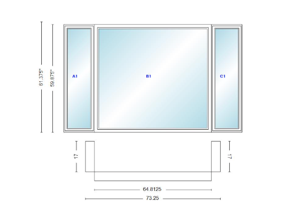 Andersen 400 series casement bay window left-stationary-right 73 1/4" wide picture with casement flankers 90 degree angle of deflection vinyl exterior wood interior low-e4 dual pane argon gas