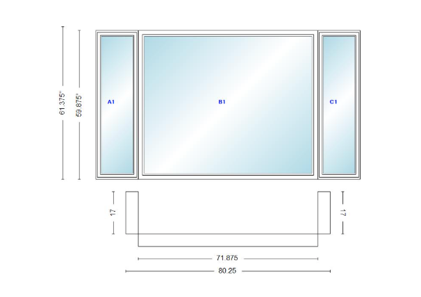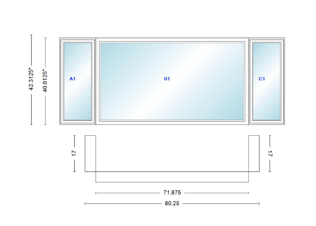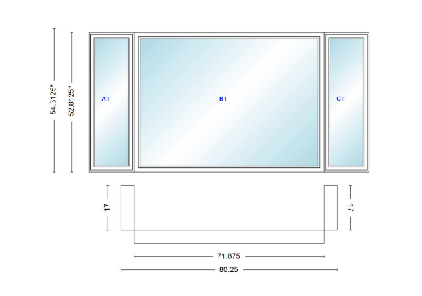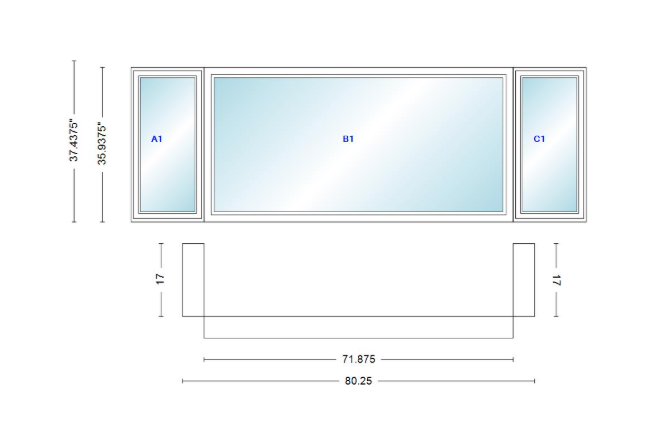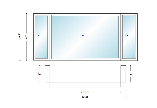Andersen 400 series casement bay window left-stationary-right 80 1/4" wide picture with casement flankers 90 degree angle of deflection vinyl exterior wood interior low-e4 dual pane argon gas