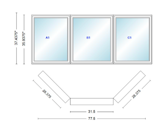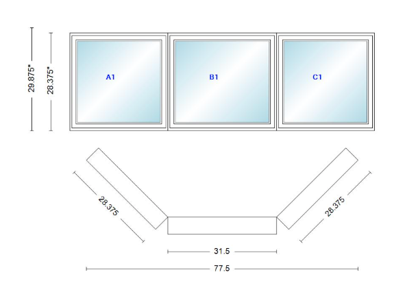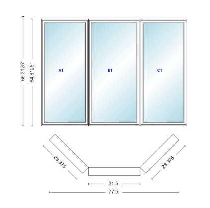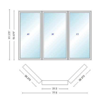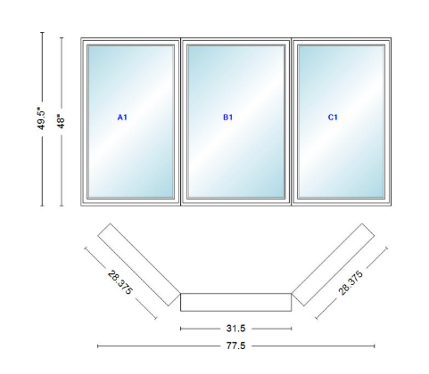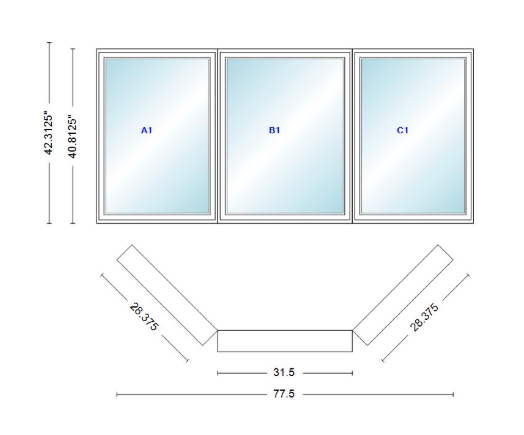 Andersen 400 series casement bay window left-stationary-right 77 1/2" wide casement with casement flankers 45 degree angle of deflection vinyl exterior wood interior low-e4 dual pane argon gas