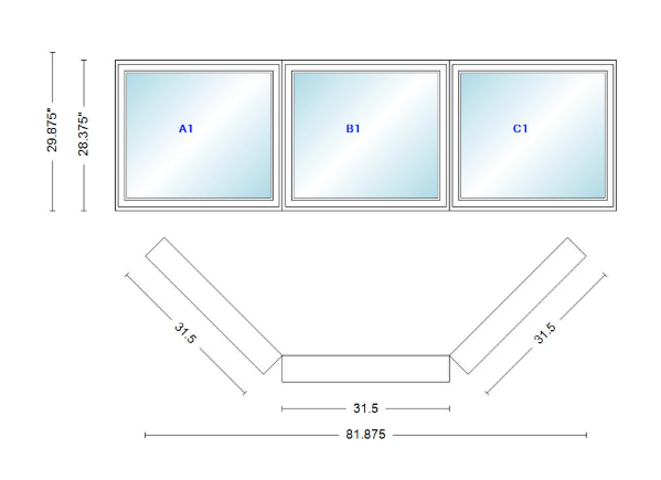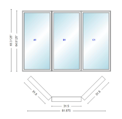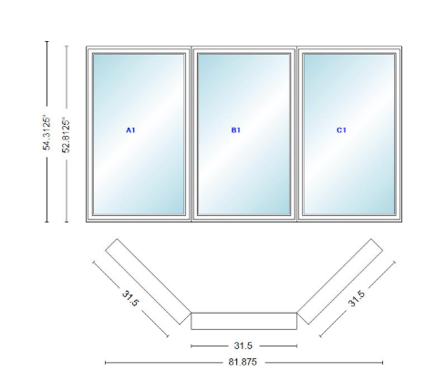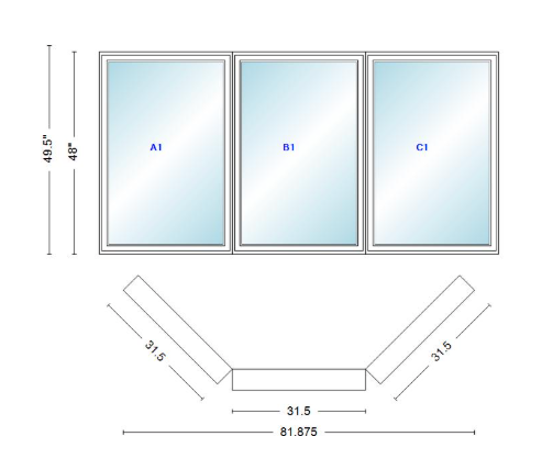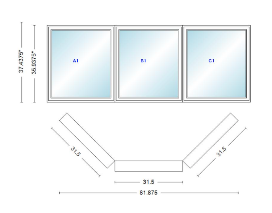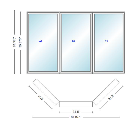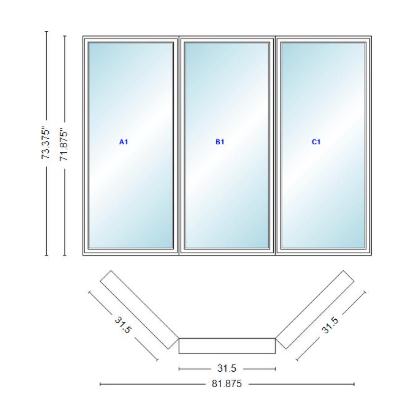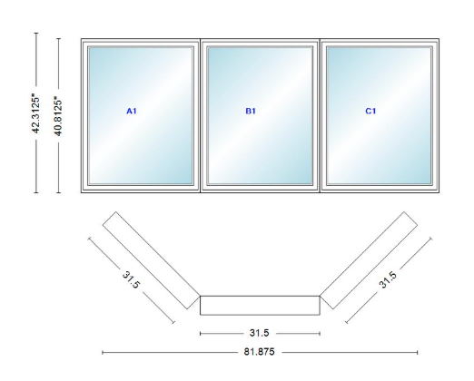 Andersen 400 series casement bay window left-stationary-right 81 7/8" wide casement with casement flankers 45 degree angle of deflection vinyl exterior wood interior low-e4 dual pane argon gas