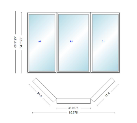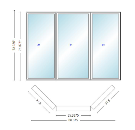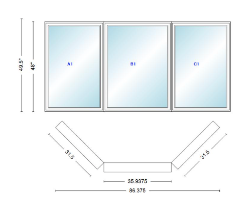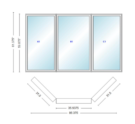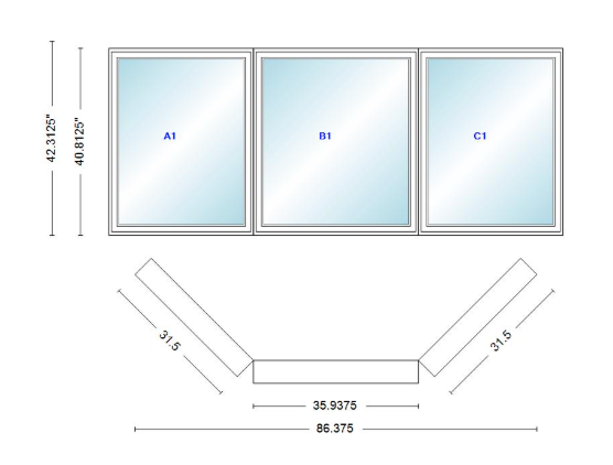 Andersen 400 series casement bay window left-stationary-right 86 3/8" wide casement with casement flankers 45 degree angle of deflection vinyl exterior wood interior low-e4 dual pane argon gas