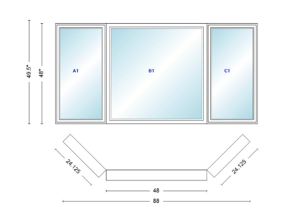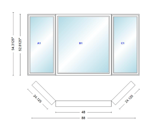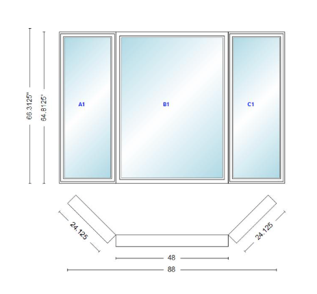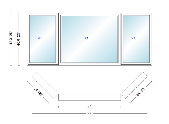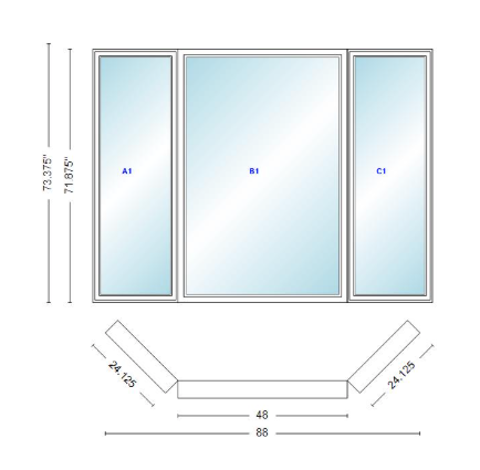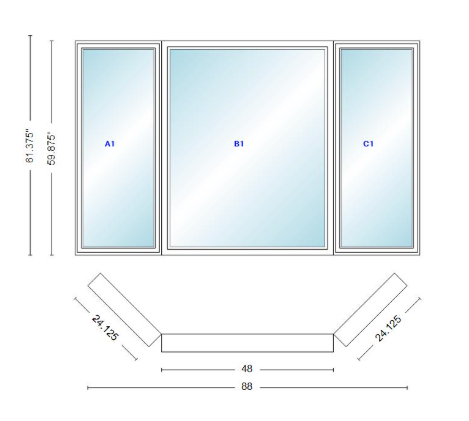 Andersen 400 series casement bay window left-stationary-right 88" wide picture with casement flankers 45 degree angle of deflection vinyl exterior wood interior low-e4 dual pane argon gas