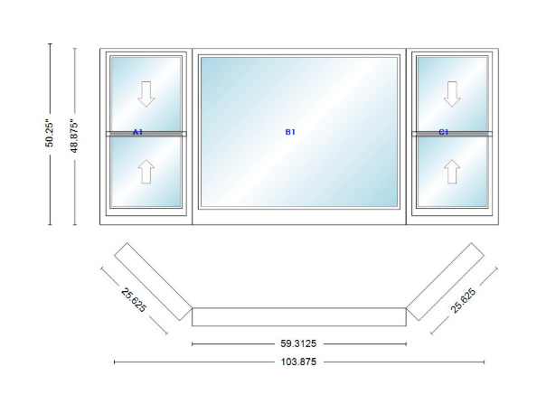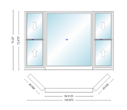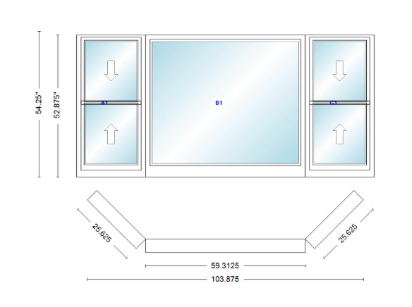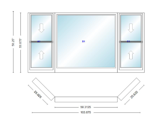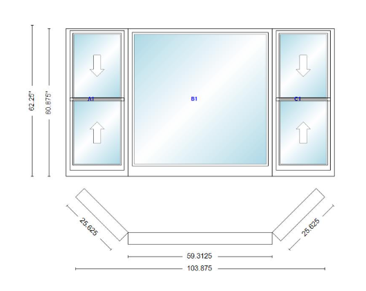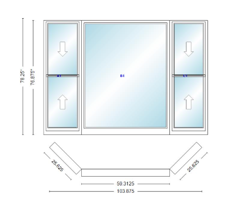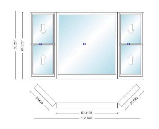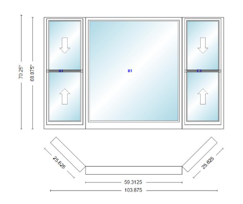 Andersen 400 series double hung bay window 103 7/8" wide picture with double hung flankers 45 degree angle of deflection vinyl exterior wood interior low-e4 dual pane argon gas
