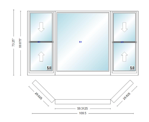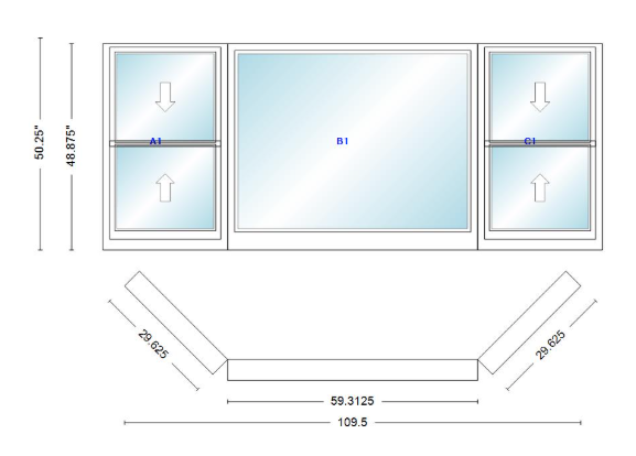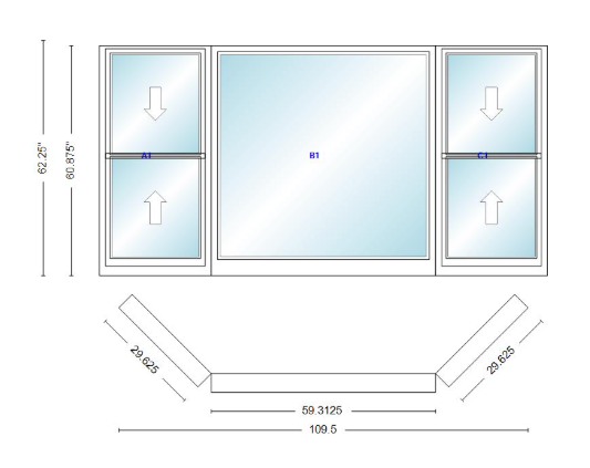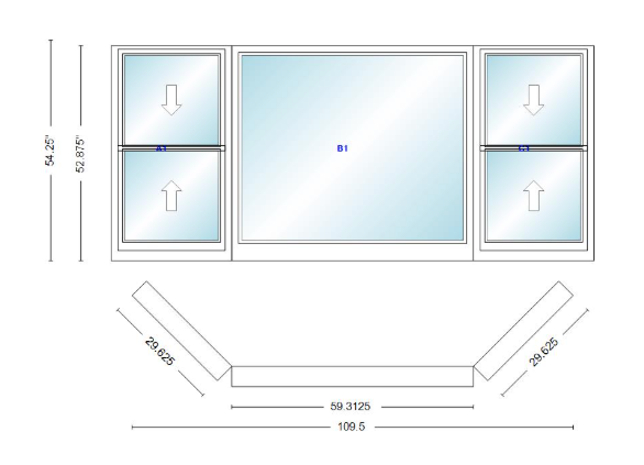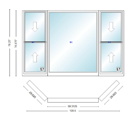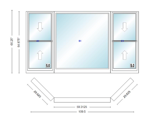 Andersen 400 series double hung bay window 109 1/2" wide picture with double hung flankers 45 degree angle of deflection vinyl exterior wood interior low-e4 dual pane argon gas