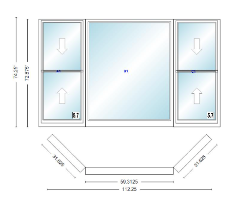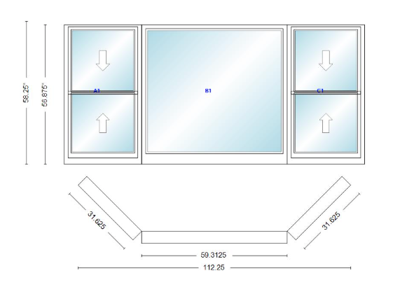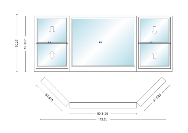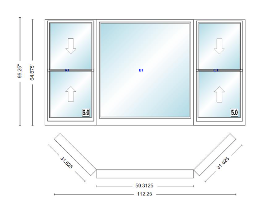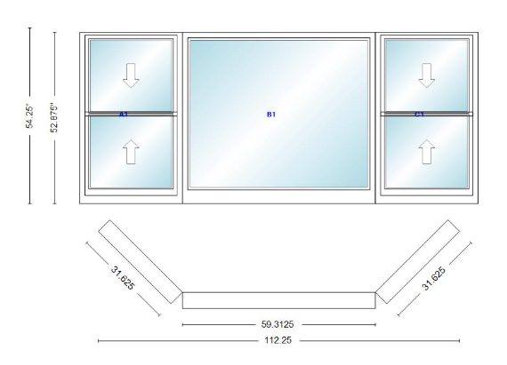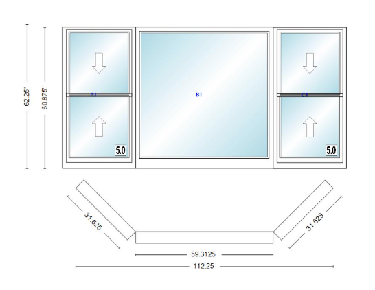 Andersen 400 series double hung bay window 112 1/4" wide picture with double hung flankers 45 degree angle of deflection vinyl exterior wood interior low-e4 dual pane argon gas