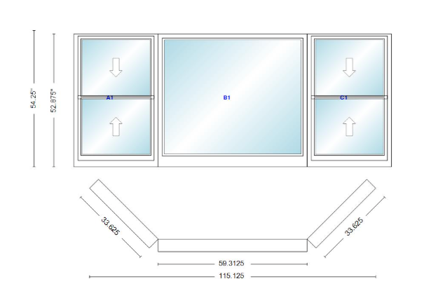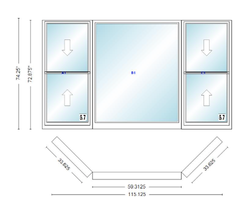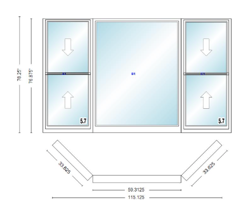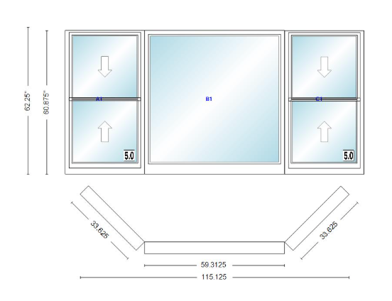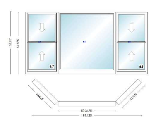 Andersen 400 series double hung bay window 115 1/8" wide picture with double hung flankers 45 degree angle of deflection vinyl exterior wood interior low-e4 dual pane argon gas