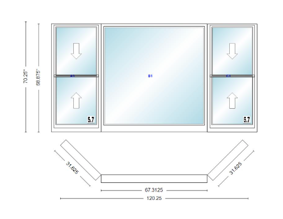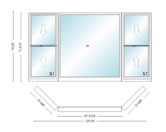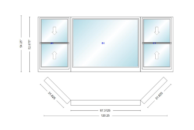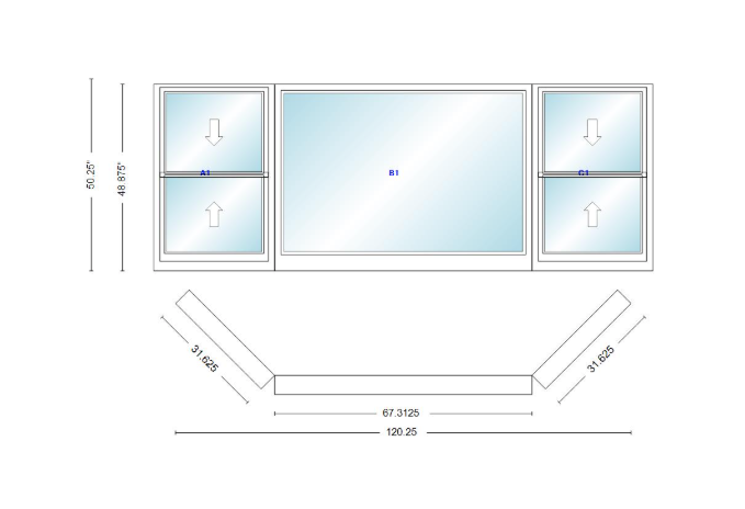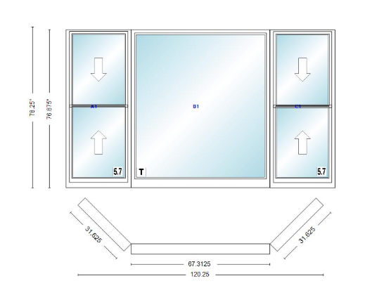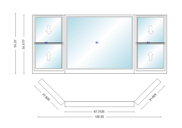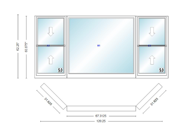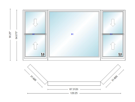 Andersen 400 series double hung bay window 120 1/4" wide picture with double hung flankers 45 degree angle of deflection vinyl exterior wood interior low-e4 dual pane argon gas