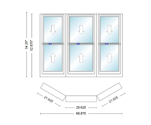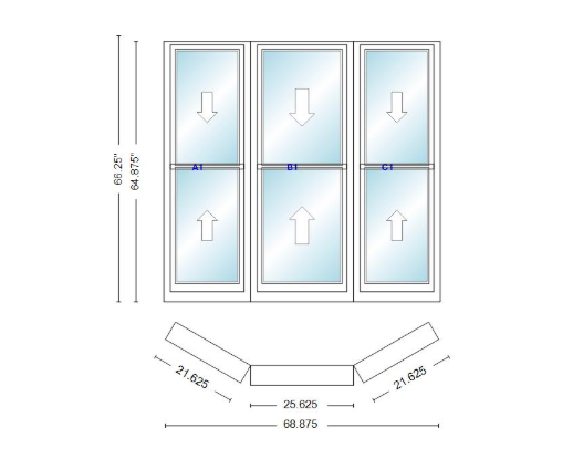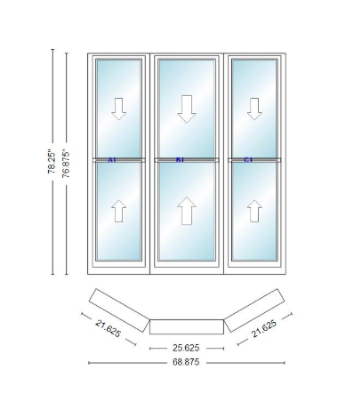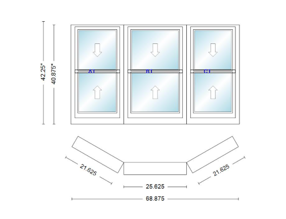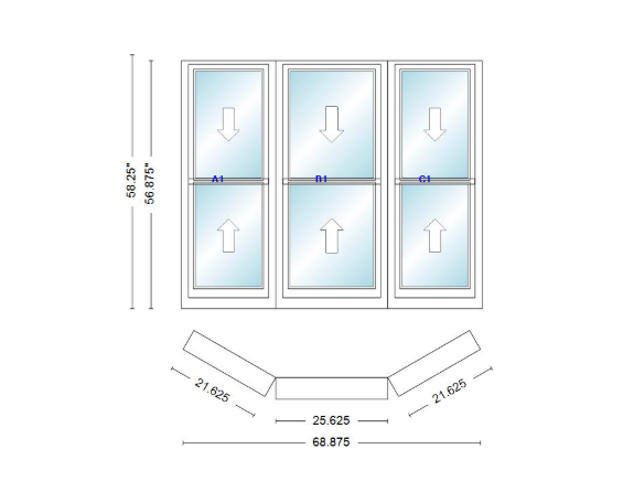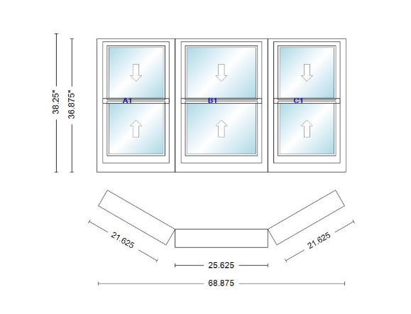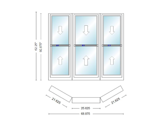 Andersen 400 series double hung bay window 68 7/8" wide double hung with double hung flankers 30 degree angle of deflection vinyl exterior wood interior low-e4 dual pane argon gas