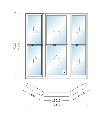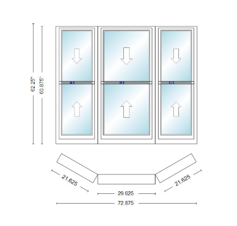 Andersen 400 series double hung bay window 72 7/8" wide double hung with double hung flankers 30 degree angle of deflection vinyl exterior wood interior low-e4 dual pane argon gas