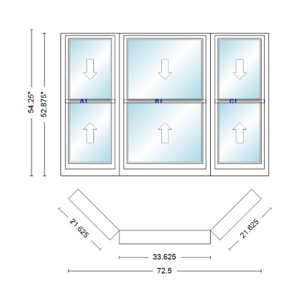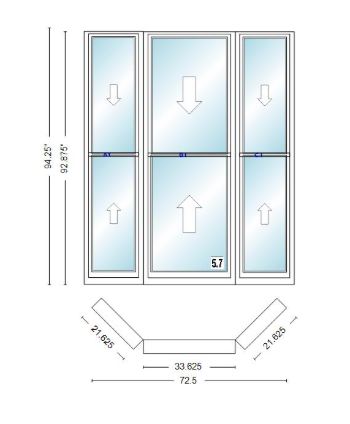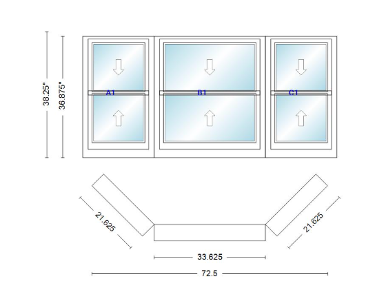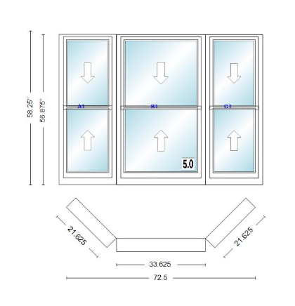 Andersen 400 series double hung bay window 72 1/2" wide double hung with double hung flankers 45 degree angle of deflection vinyl exterior wood interior low-e4 dual pane argon gas