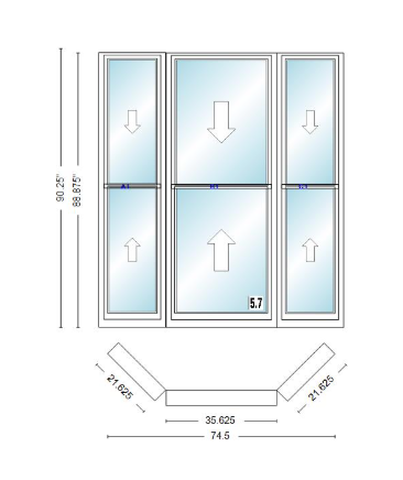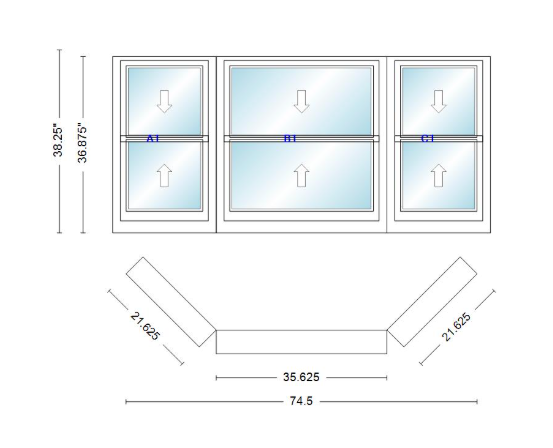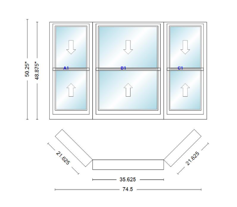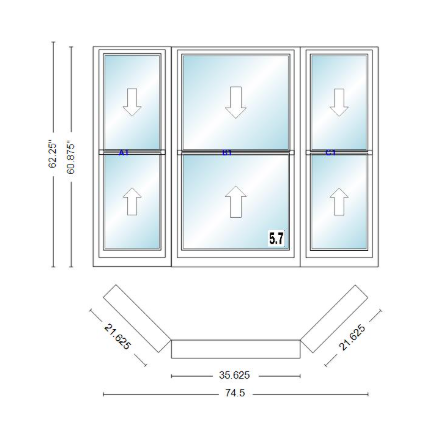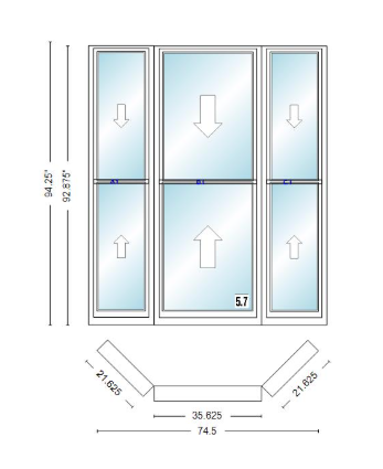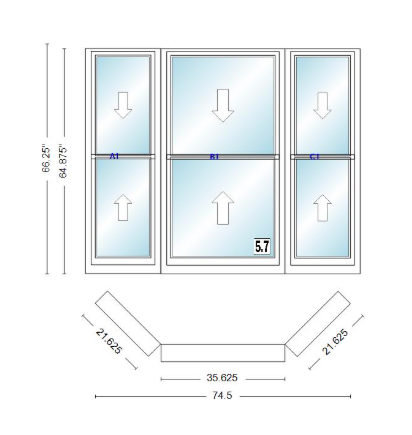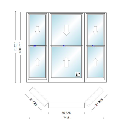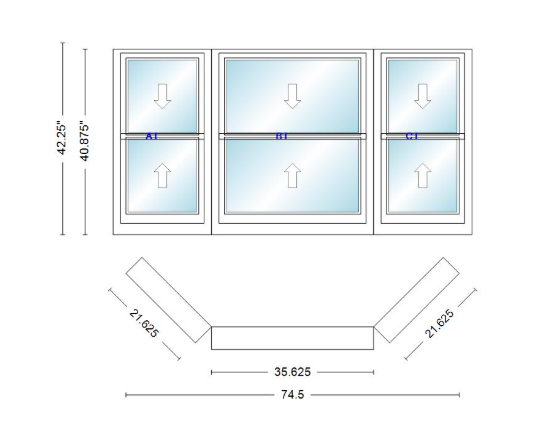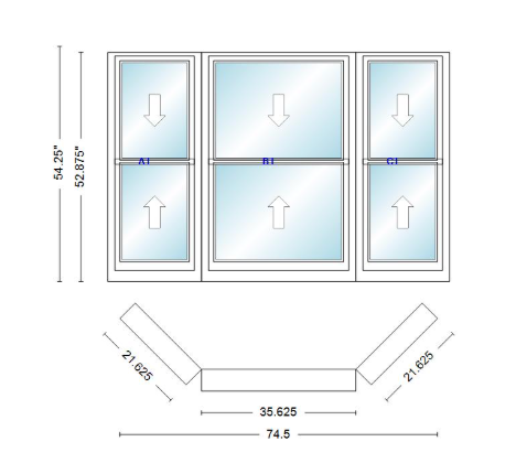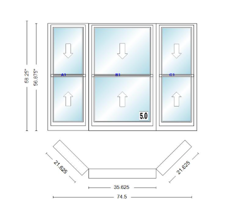 Andersen 400 series double hung bay window 74 1/2" wide double hung with double hung flankers 45 degree angle of deflection vinyl exterior wood interior low-e4 dual pane argon gas