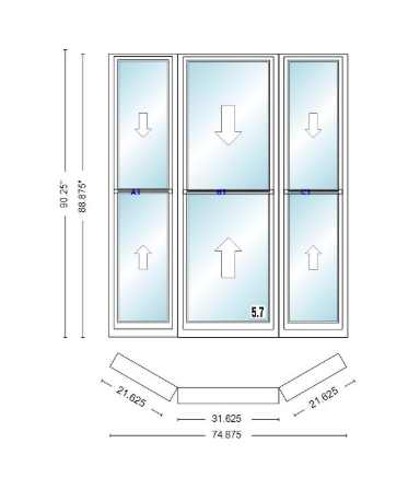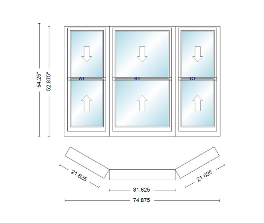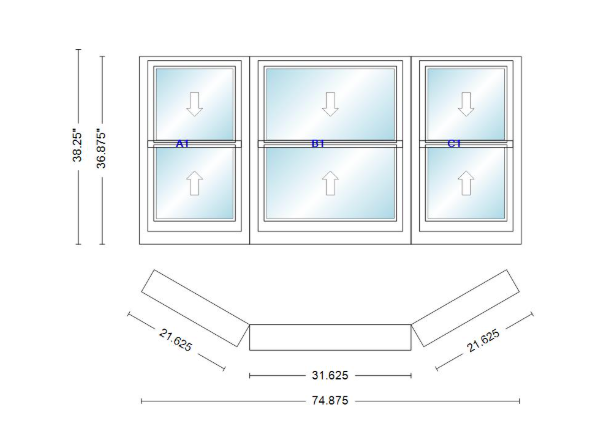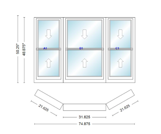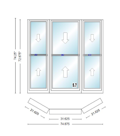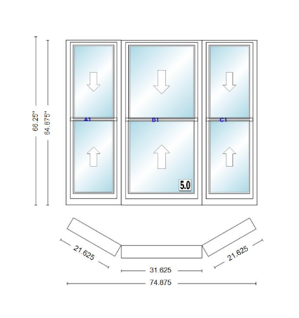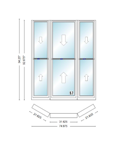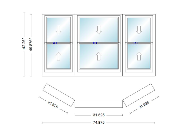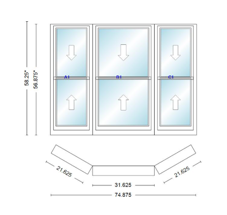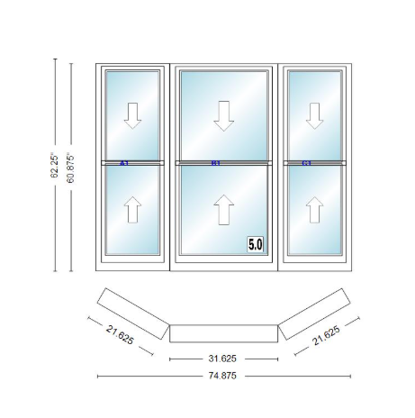 Andersen 400 series double hung bay window 74 7/8" wide double hung with double hung flankers 30 degree angle of deflection vinyl exterior wood interior low-e4 dual pane argon gas