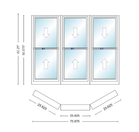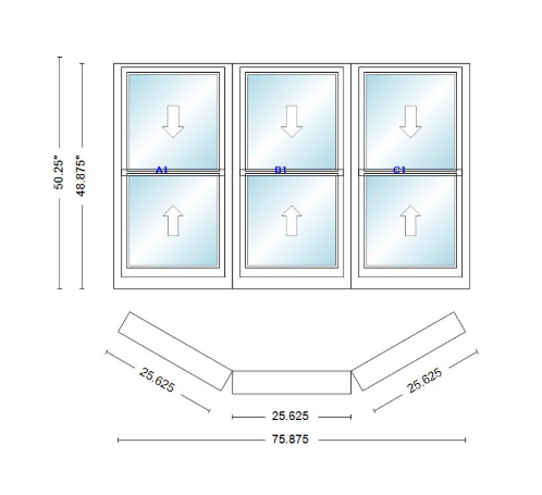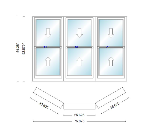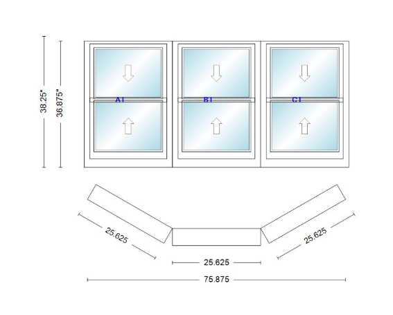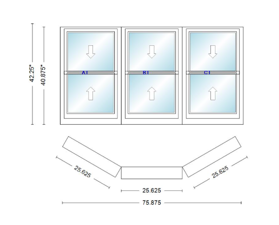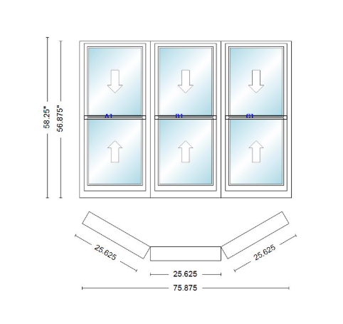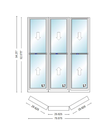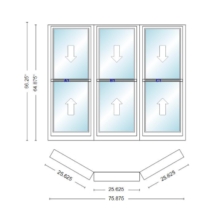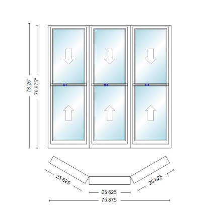 Andersen 400 series double hung bay window 75 7/8" wide double hung with double hung flankers 30 degree angle of deflection vinyl exterior wood interior low-e4 dual pane argon gas