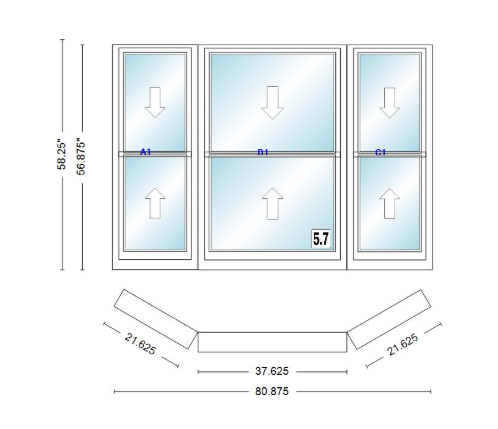 Andersen 400 series double hung bay window 80 7/8" wide double hung with double hung flankers 30 degree angle of deflection vinyl exterior wood interior low-e4 dual pane argon gas