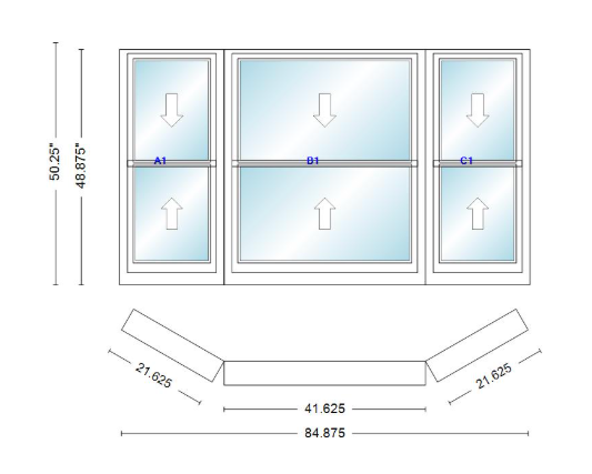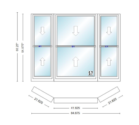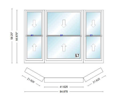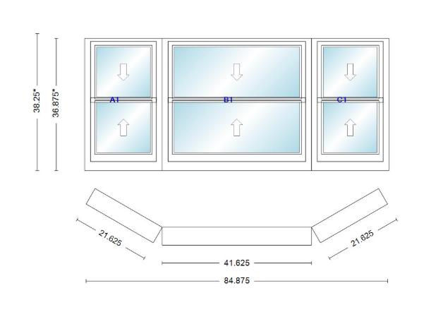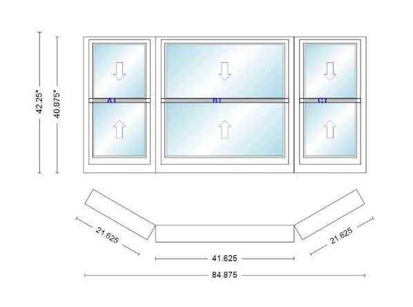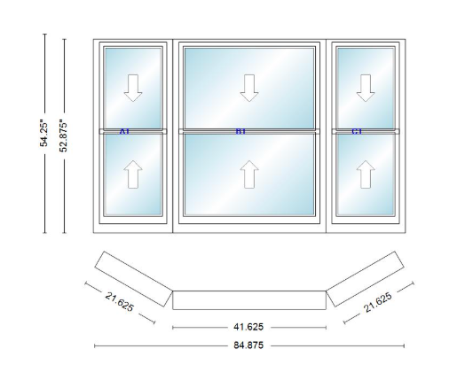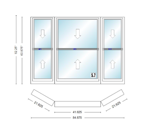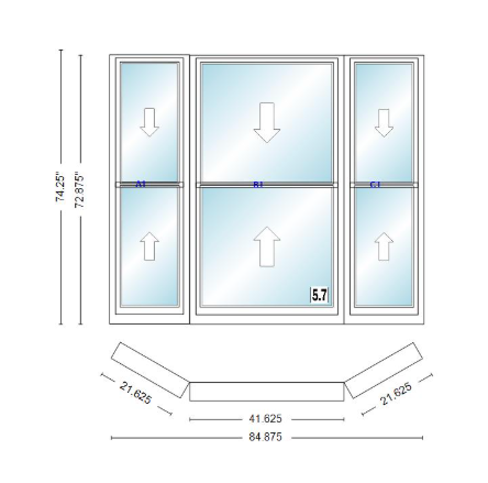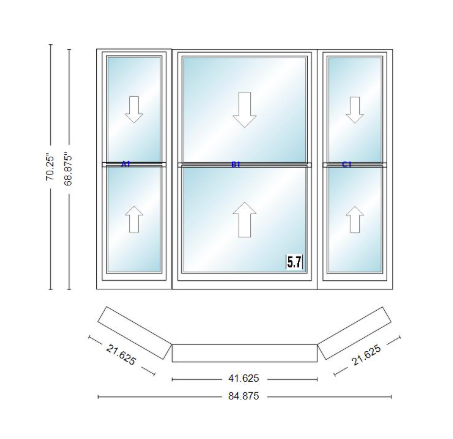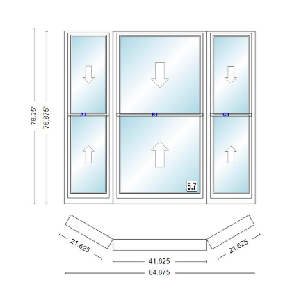 Andersen 400 series double hung bay window 84 7/8" wide double hung with double hung flankers 30 degree angle of deflection vinyl exterior wood interior low-e4 dual pane argon gas