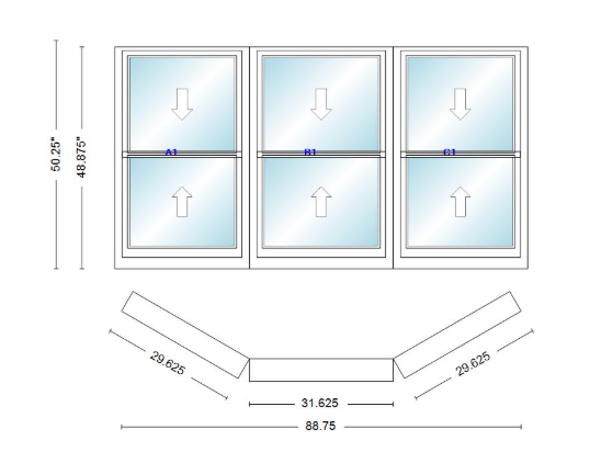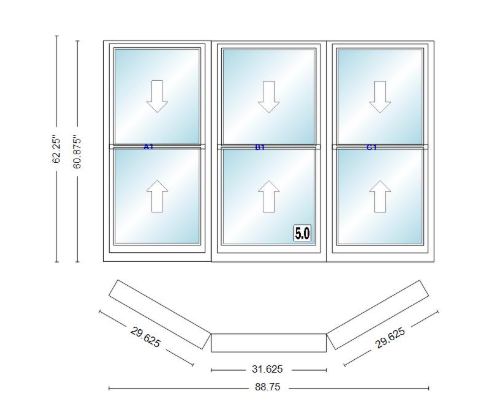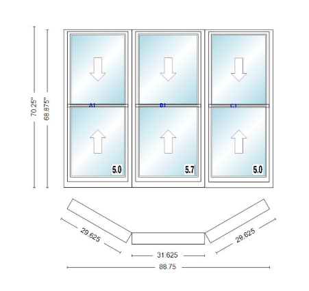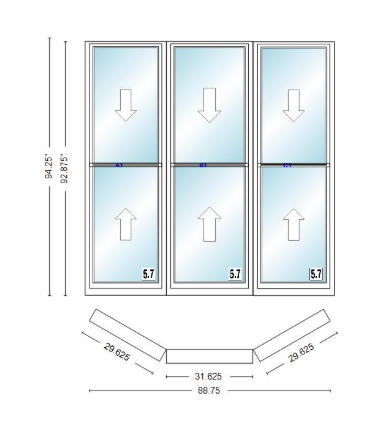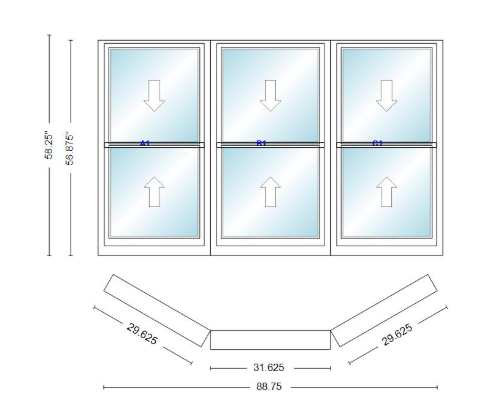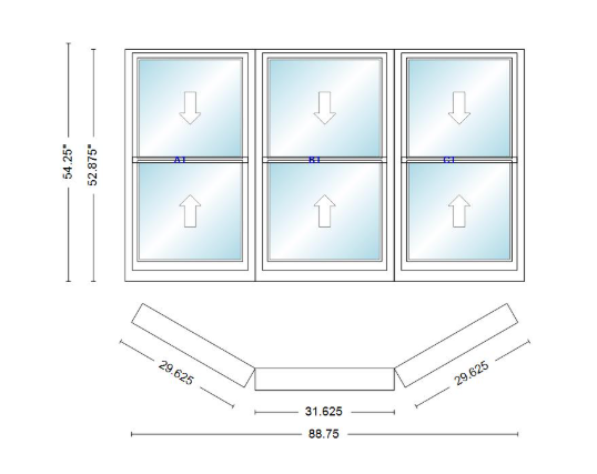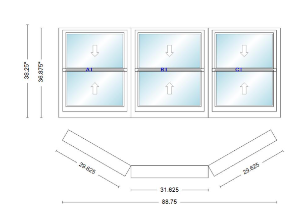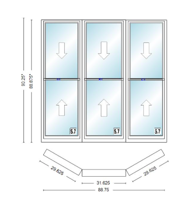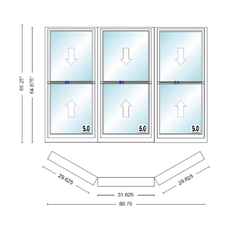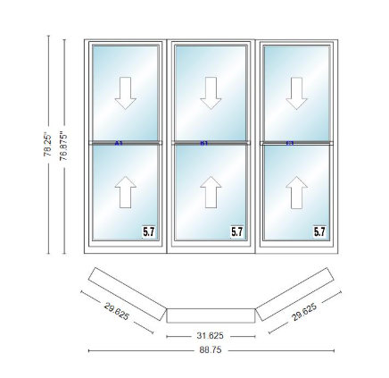 Andersen 400 series double hung bay window 88 3/4" wide double hung with double hung flankers 30 degree angle of deflection vinyl exterior wood interior low-e4 dual pane argon gas