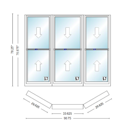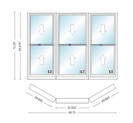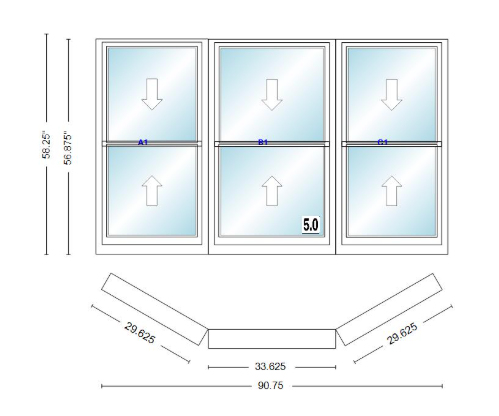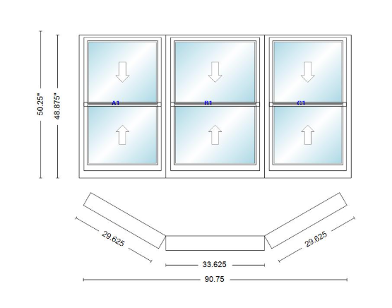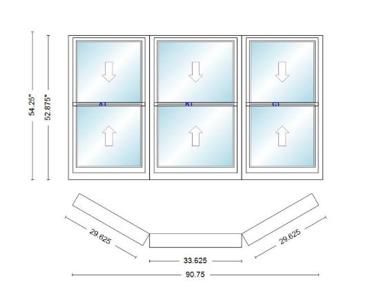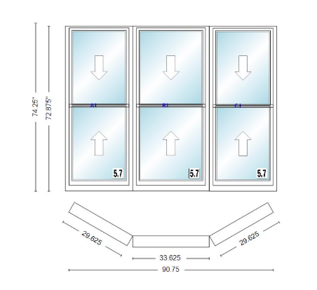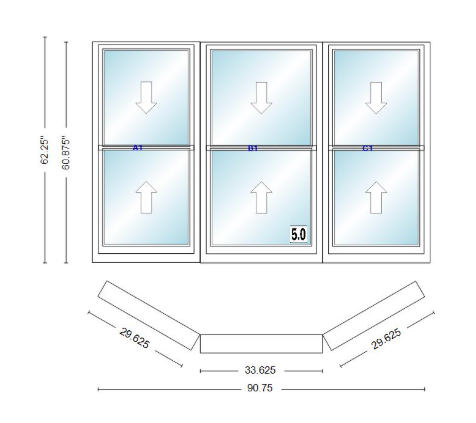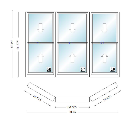 Andersen 400 series double hung bay window 90 3/4" wide double hung with double hung flankers 30 degree angle of deflection vinyl exterior wood interior low-e4 dual pane argon gas