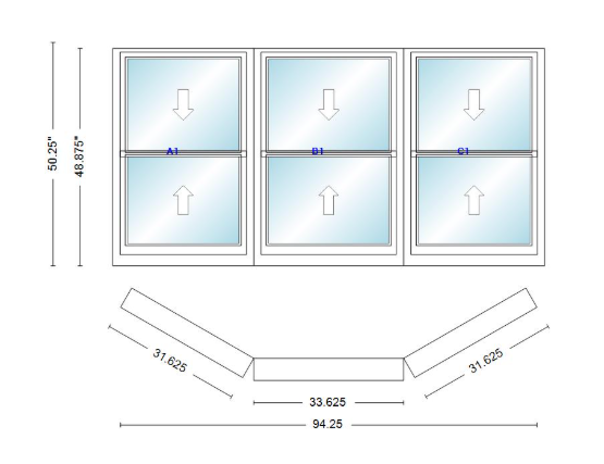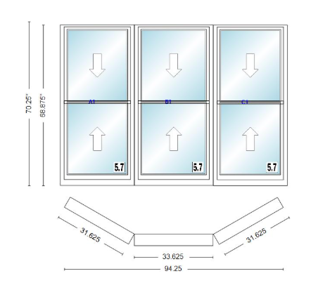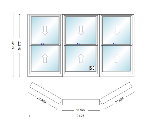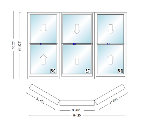 Andersen 400 series double hung bay window 94 1/4" wide double hung with double hung flankers 30 degree angle of deflection vinyl exterior wood interior low-e4 dual pane argon gas