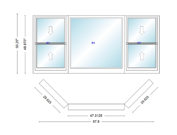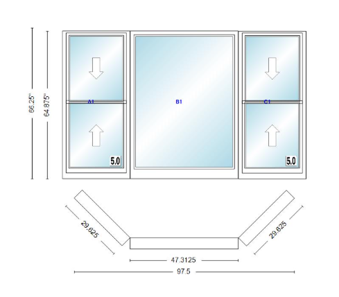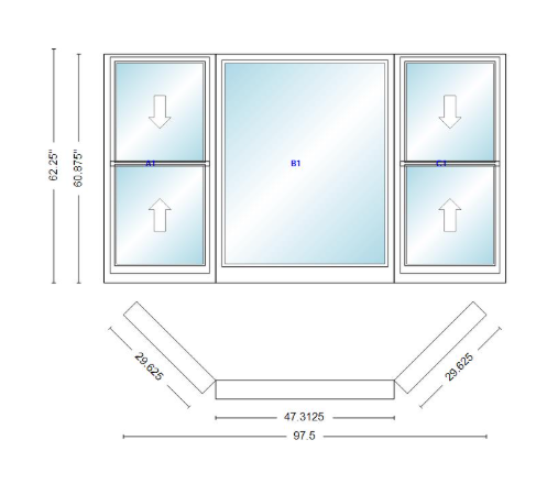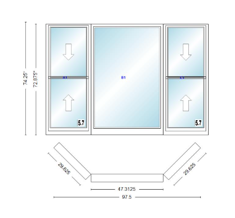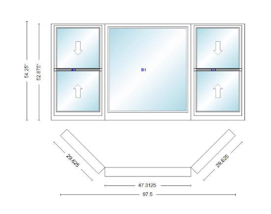 Andersen 400 series double hung bay window 97 1/2" wide picture with double hung flankers 45 degree angle of deflection vinyl exterior wood interior low-e4 dual pane argon gas