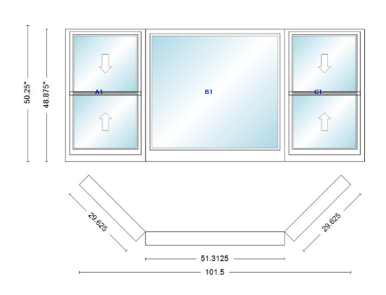 Andersen 400 series double hung bay window 101 1/2" wide picture with double hung flankers 45 degree angle of deflection vinyl exterior wood interior low-e4 dual pane argon gas