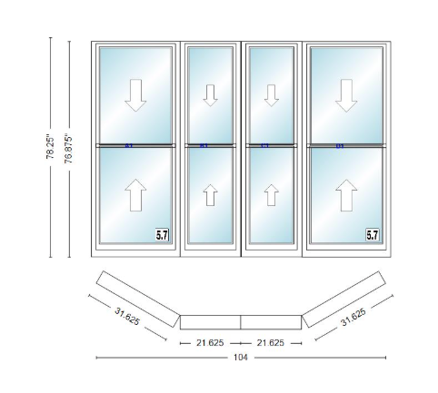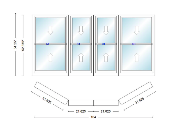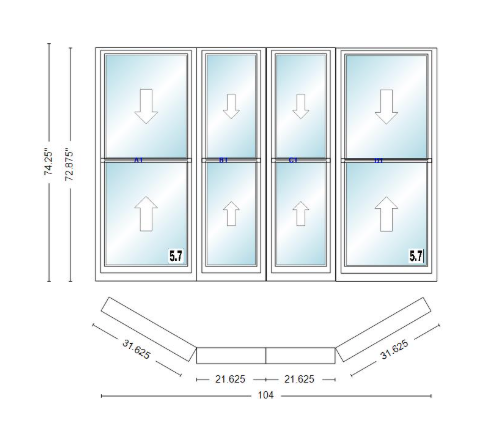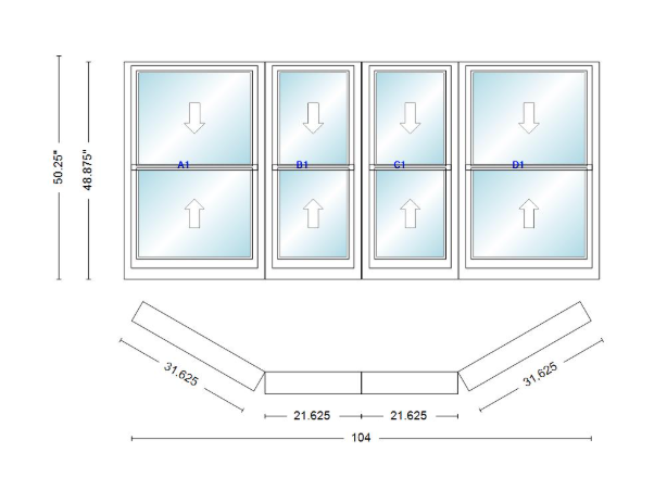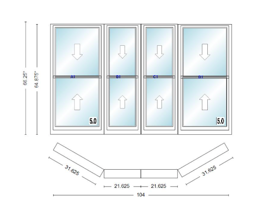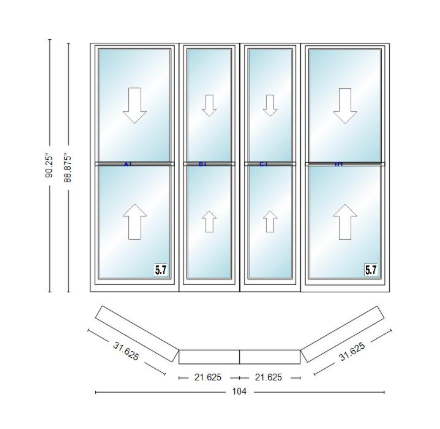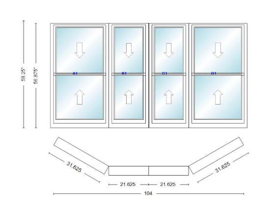 Andersen 400 series double hung bay window 104" wide double hung with double hung flankers 30 degree angle of deflection vinyl exterior wood interior low-e4 dual pane argon gas