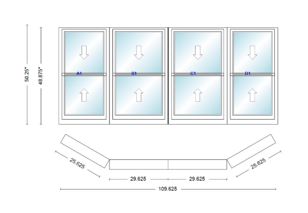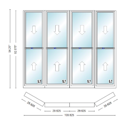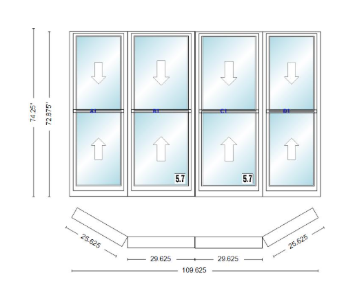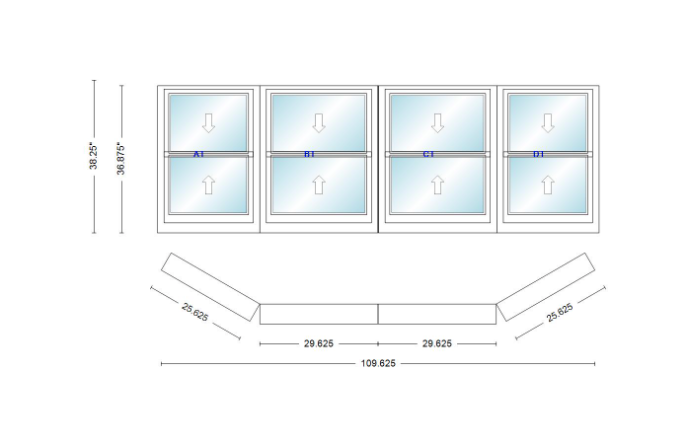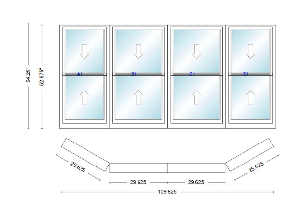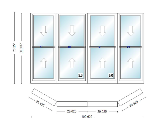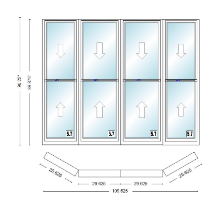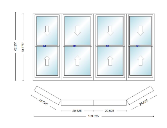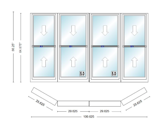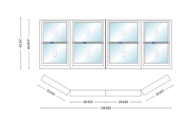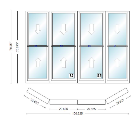 Andersen 400 series double hung bay window 109 5/8" wide double hung with double hung flankers 30 degree angle of deflection vinyl exterior wood interior low-e4 dual pane argon gas