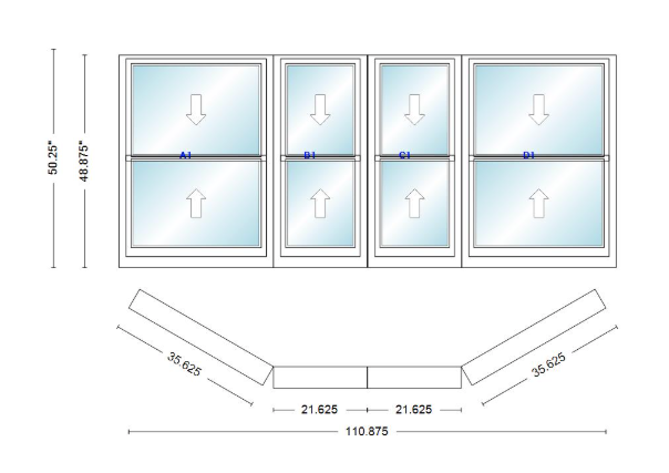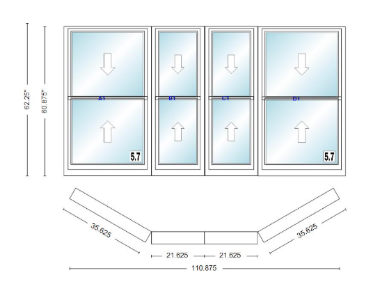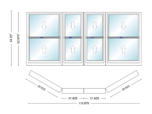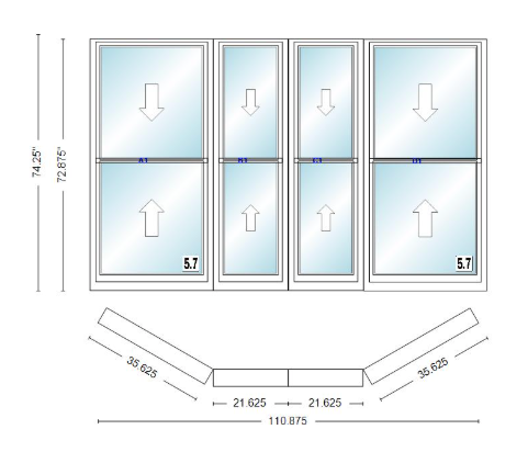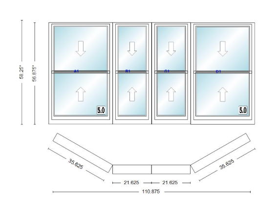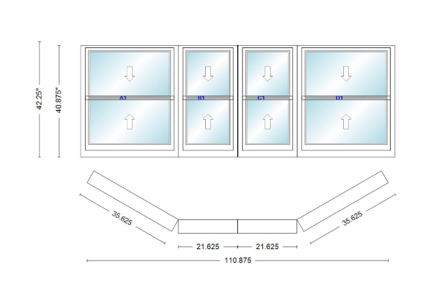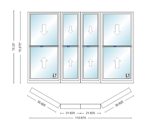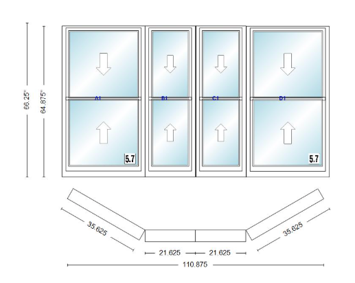 Andersen 400 series double hung bay window 110 7/8" wide double hung with double hung flankers 30 degree angle of deflection vinyl exterior wood interior low-e4 dual pane argon gas
