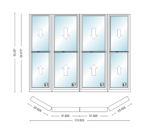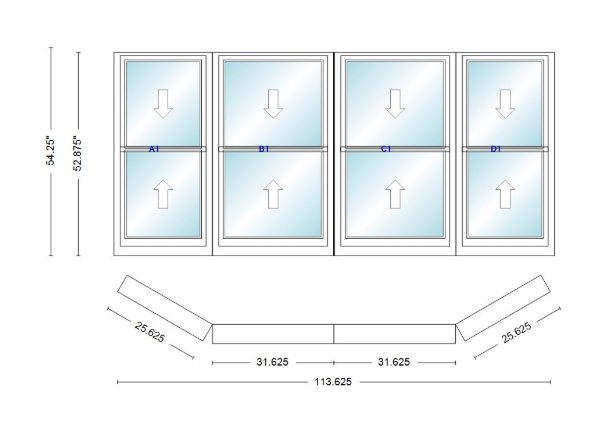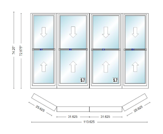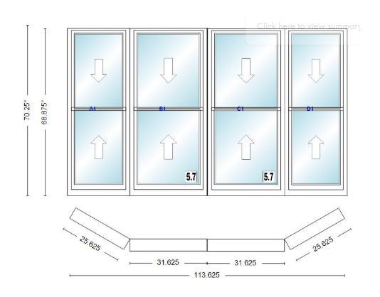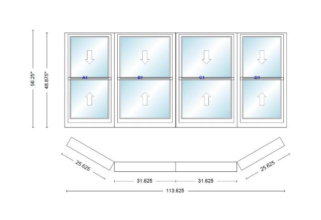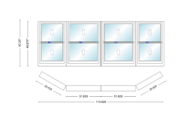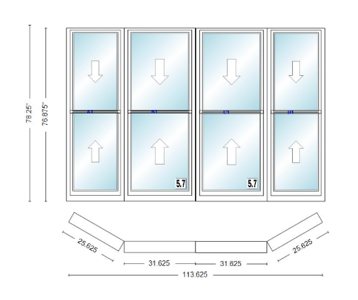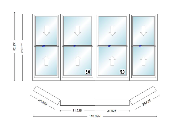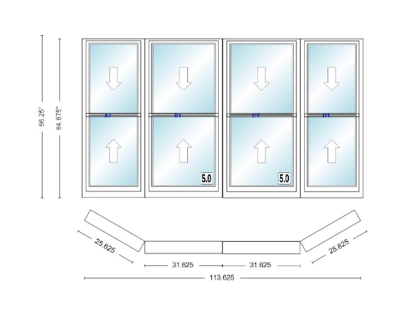 Andersen 400 series double hung bay window 113 5/8" wide double hung with double hung flankers 30 degree angle of deflection vinyl exterior wood interior low-e4 dual pane argon gas