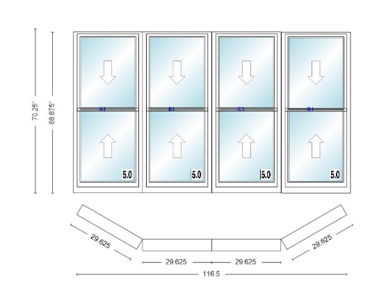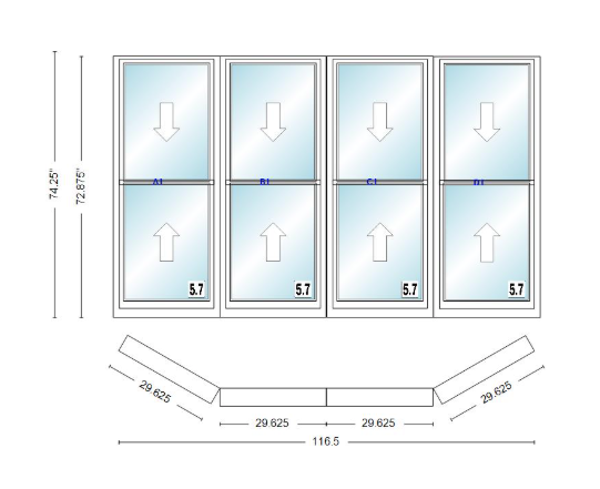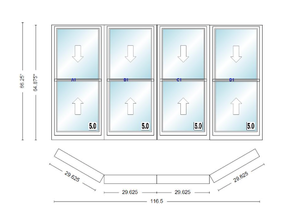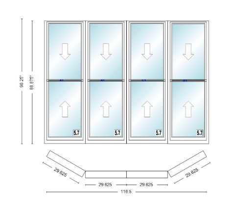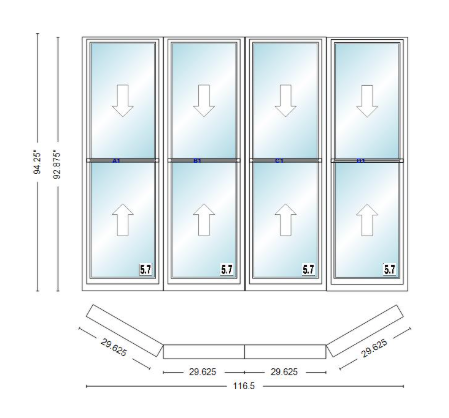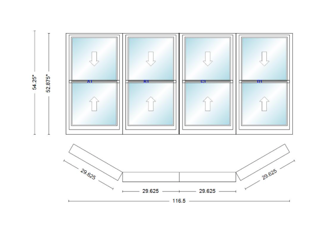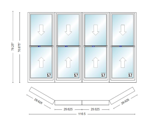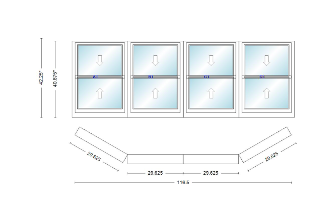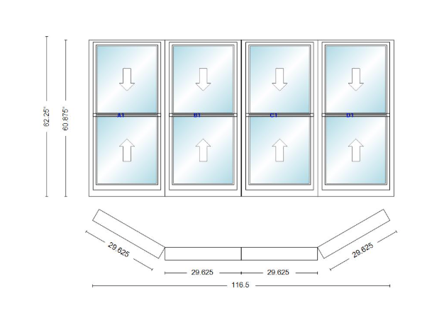 Andersen 400 series double hung bay window 116 1/2" wide double hung with double hung flankers 30 degree angle of deflection vinyl exterior wood interior low-e4 dual pane argon gas