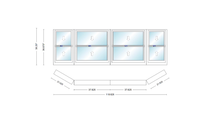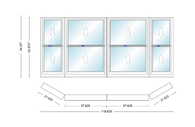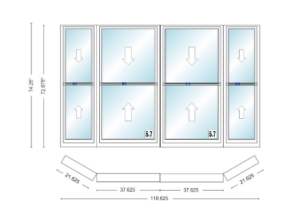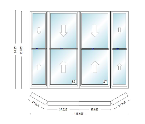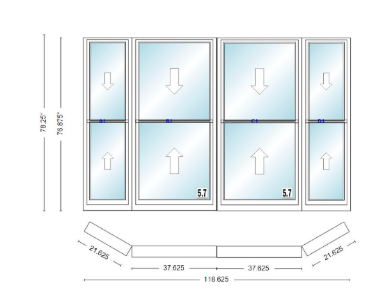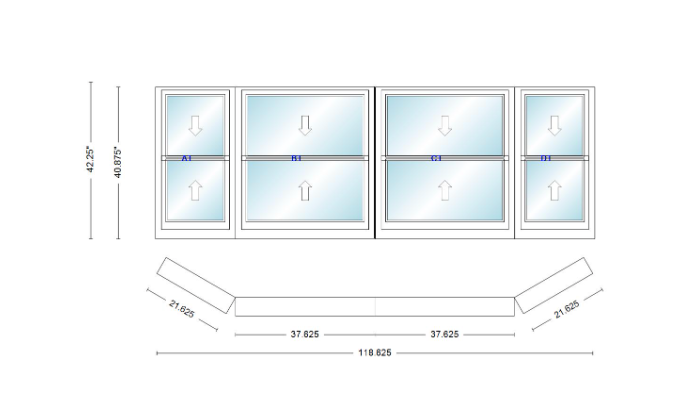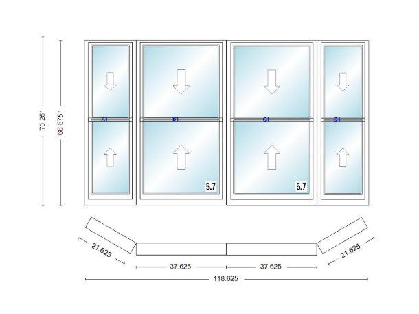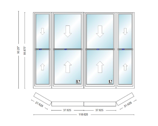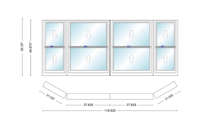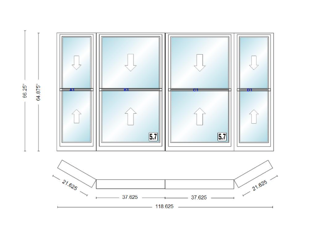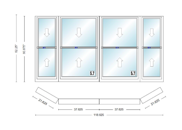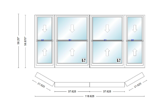 Andersen 400 series double hung bay window 118 5/8" wide double hung with double hung flankers 30 degree angle of deflection vinyl exterior wood interior low-e4 dual pane argon gas