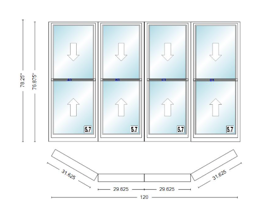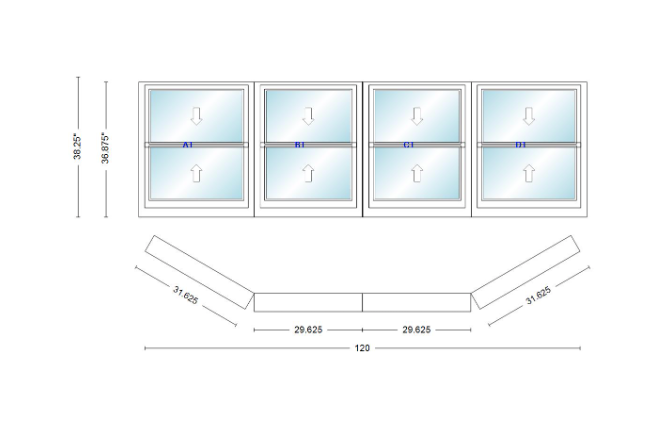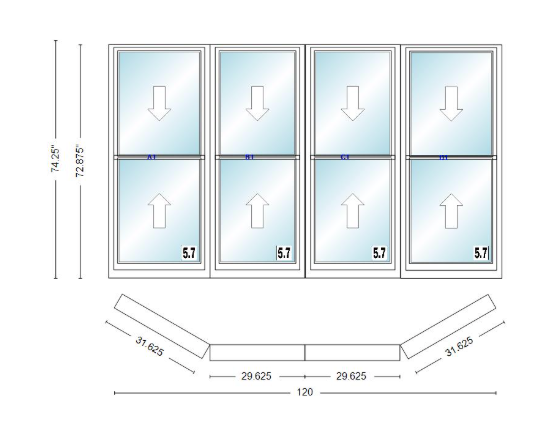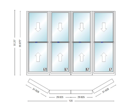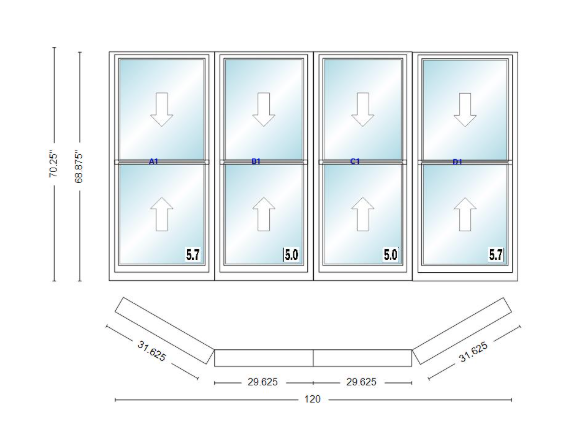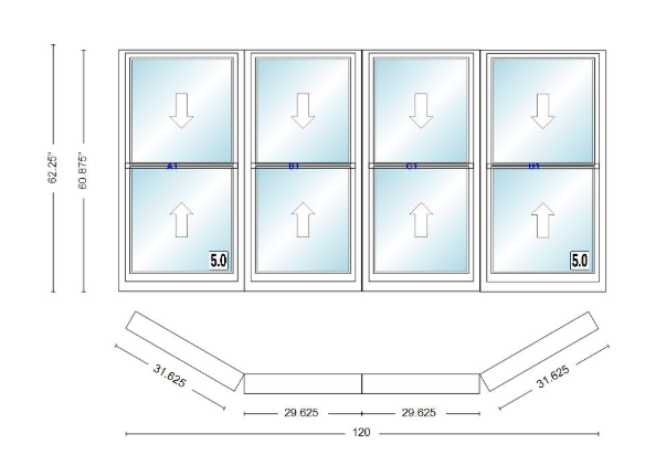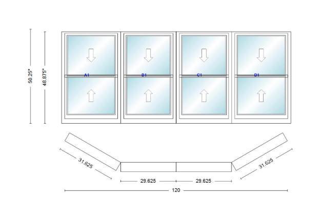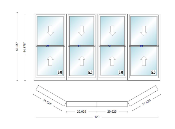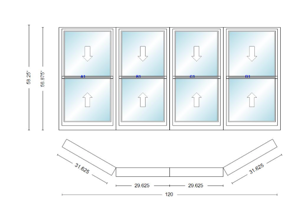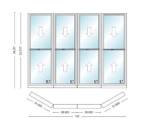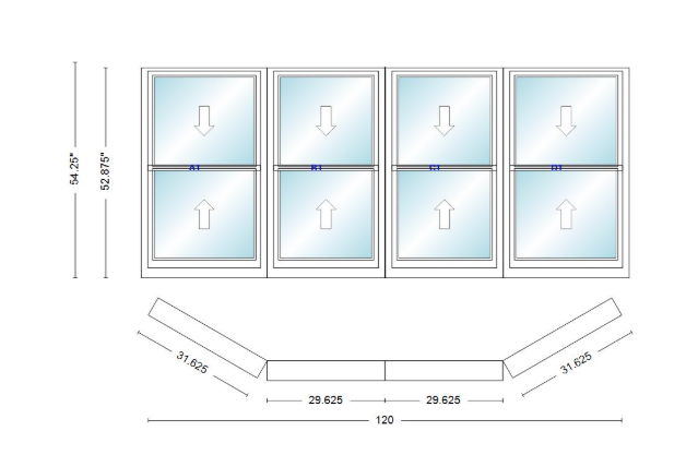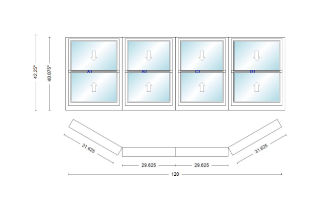 Andersen 400 series double hung bay window 120" wide double hung with double hung flankers 30 degree angle of deflection vinyl exterior wood interior low-e4 dual pane argon gas