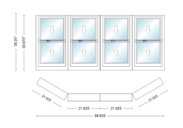Andersen 400 series double hung bay window 86 5/8" wide double hung with double hung flankers 30 degree angle of deflection vinyl exterior wood interior low-e4 dual pane argon gas